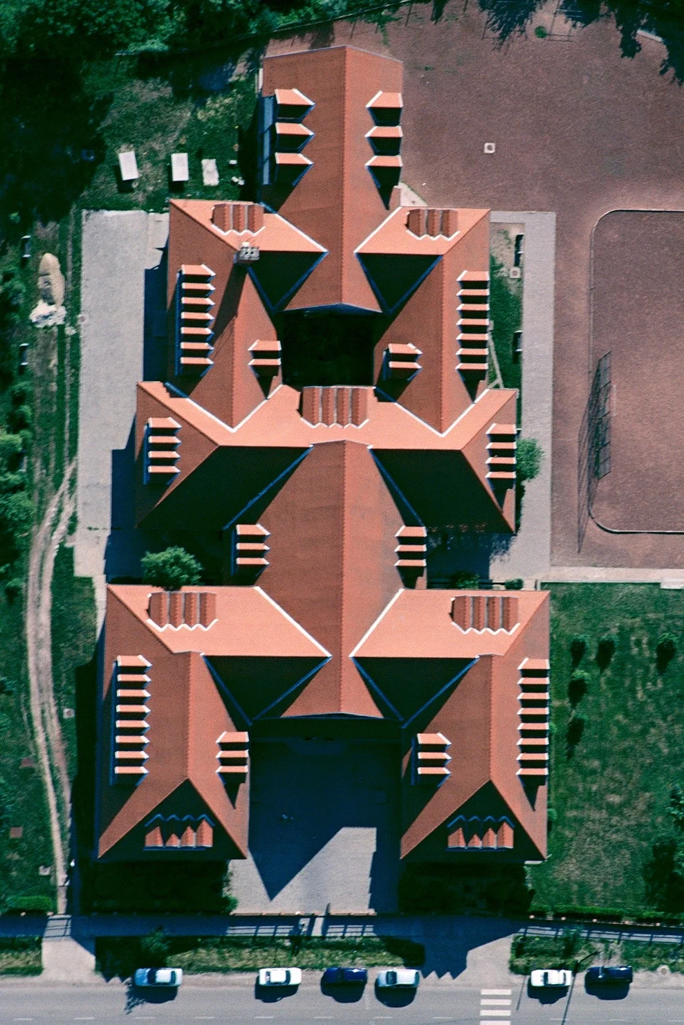 Auf einem Ungarnflug kam mir bei Eger ungesucht eine ausgesucht adrette Dachlandschaft unter die Kamera: Lukarnen sitzen auf einer Komposition von Sattel- und Walmdach. Lukarnen schaffen zusätzlichen Raum in der Dachschräge, sorgen für Belüftung und Beleuchtung – und sind, jedenfalls von oben gesehen, ein schmückendes Gestaltungselement. Die Art des mit einer so aufwendigen Bedachung ausgezeichneten Gebäudes war aus den Spuren im Umkreis nicht erkennbar, sie lieferten keine Anhaltspunkte über seine Nutzung. Suchaktionen mit Google Earth blieben erfolglos. Das Flugbild wurde schliesslich mit einem Fragezeichen in Ausstellungen in Pécs und Budapest und zuletzt auch noch am ungarischen Fernsehen mit der Bitte um Identifikation gezeigt – aber Rätsel blieb Rätsel.