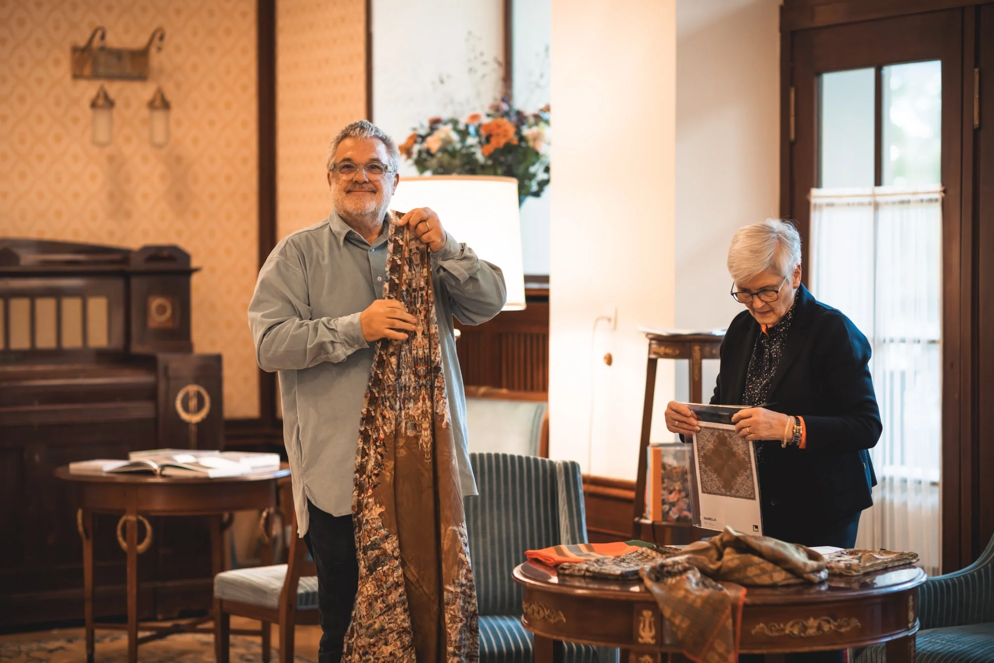 Aber auch die Schweizer Mode-Dame Christa de Carouge bezog ihre Stoffe hier bei Martin Leuthold. Eines Tages flatterte ihr eine Anfrage vom «Felsenfest» in Bivio auf den Tisch. Das ist eine Veranstaltung für Kunsthandwerk. «Da kam Christa zu uns und fragte, was soll ich da mit meinen schwarzen Kleidern?» Sie habe mal zugesagt und bekäme einen Ausstellungsplatz in einem Stall mit einem Heustock und wahnsinnig schöner Atmosphäre, berichtete sie Leuthold. Und sie habe sich nun überlegt, einen Kimono zu entwerfen, den sie über den Heustock hängen könne, erklärte sie. Aber nicht in Schwarz, sondern in bunten Alpenblumen. Und sie fragte, ob Martin Leuthold vielleicht für sie so einen Stoff entwerfen könnte …?