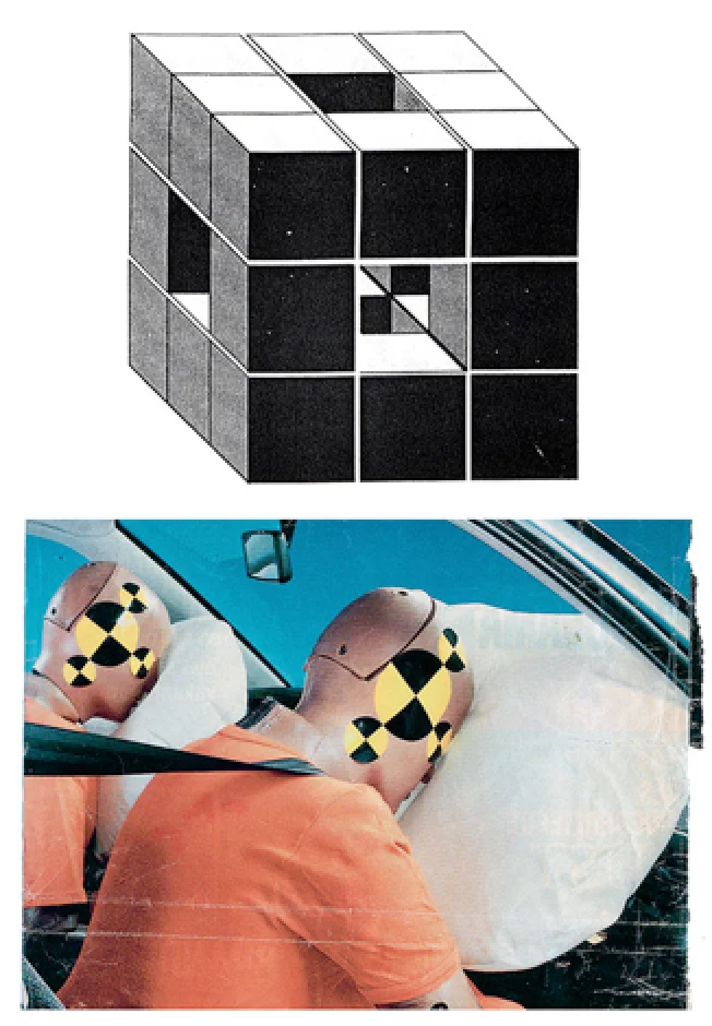 Ein Kapitel für sich sind die Diagramme (FBN). Gewaltig, was sich Menschen so ausdenken, um ihre Gedanken zu ordnen, die Zukunft zu planen oder Menschen zu steuern mit Organigrammen, Flussdiagrammen, Netzwerken, mathematischen und topologischen Modellen. Aber auch Körperschemen chinesischer Medizin, Körperschemen von Art-Brut-Künstlern, Gausssche Kurve, Risikomanagement, Alchemie, Home Monitoring and Control, Comic-Knallblasen, Schnittmengen von Katholiken und Bauern bis zum steinharten fraktalen Würfelgefängnis, das auch emblematisch auf dem Titelblatt erscheint. Ebenso auf dem Titelblatt unter dem Würfel die Aufnahme zweier Dummies, die nach einem Autocrash mit den gelb markierten Köpfen in den Airbags liegen, wie wenn sie friedlich schliefen. Das ist offensichtlich Programm: Das ganze Buch macht deutlich, wo wir hinsteuern.