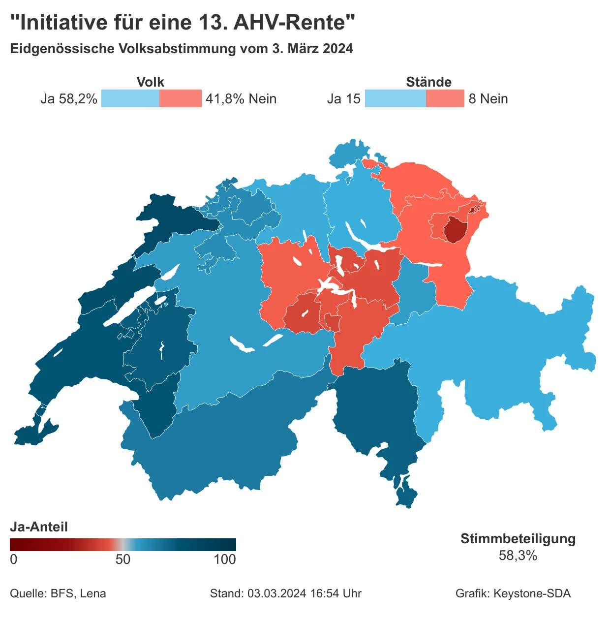 Bei der Abstimmung über die 13. AHV-Rente sind Beteiligung und Zustimmung im Vergleich zu «AHV plus»-Abstimmung markant angestiegen (um 15 bzw. 18 Prozentpunkte). In den französischsprachigen Gemeinden vergrösserte sich der Ja-Stimmenanteil um 25 Prozentpunkte, in den italienischsprachigen Gemeinden um 18 Punkte und in der Deutschschweiz um 16 Punkte.