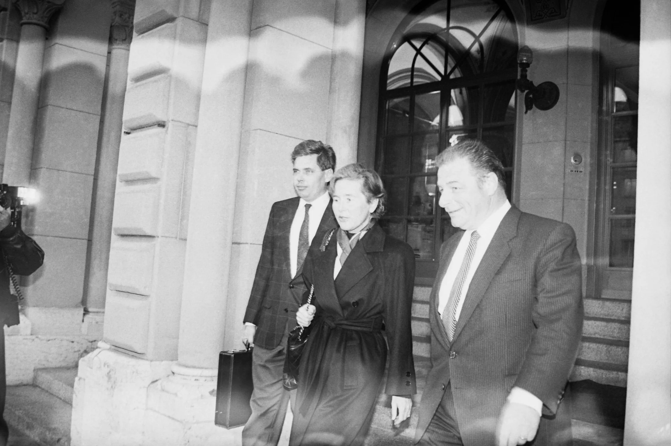 Ex-Bundesrätin Elisabeth Kopp wird nach ihrer Verabschiedung von Jean-Pascal Delamuraz aus dem Bundeshaus in Bern hinausbegleitet, 13. Januar 1989