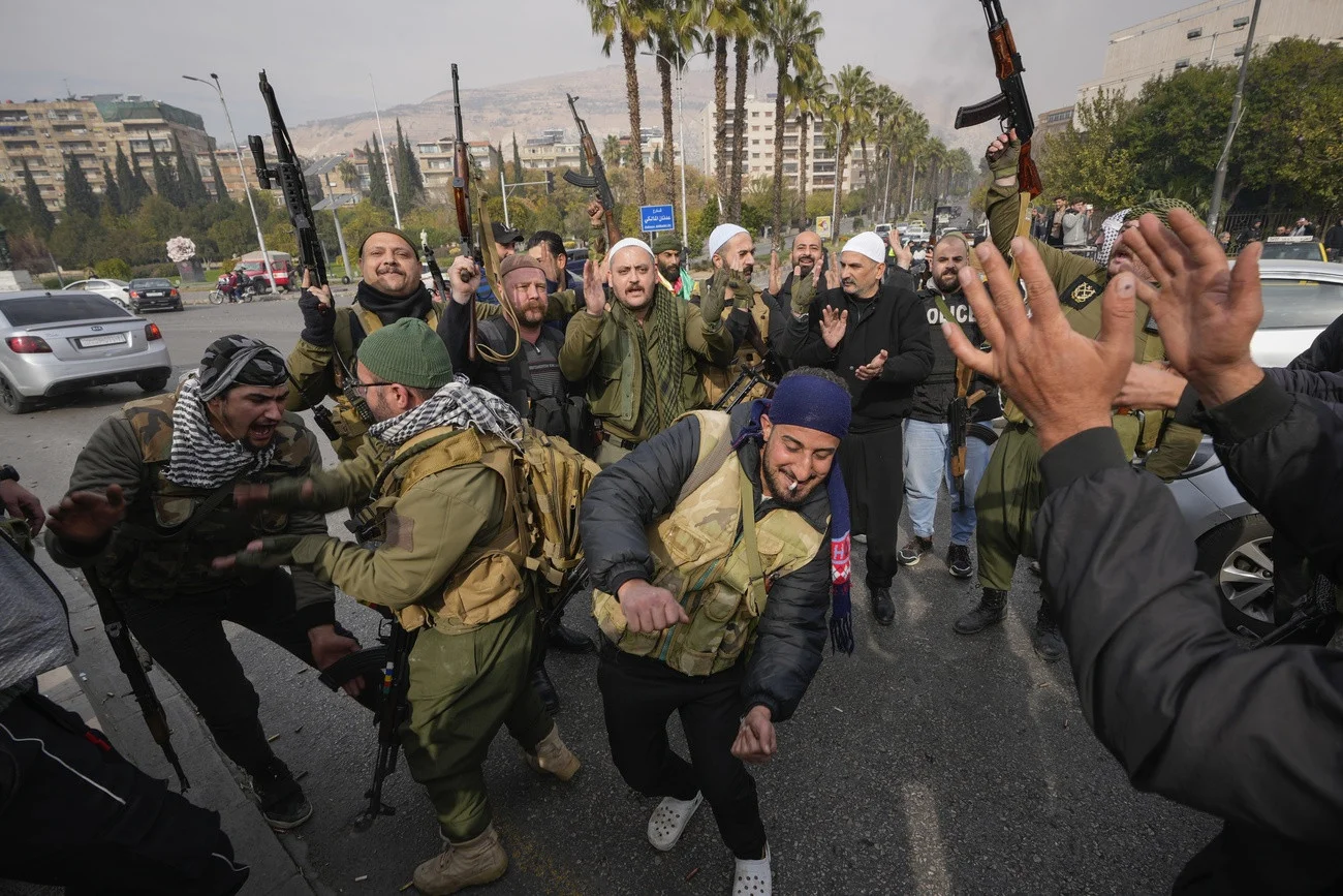 Feiernde Aufständische: Die Rebellen waren zwölf Tage zuvor in der nordsyrischen Region Idlib gestartet und hatten innert weniger Tage Aleppo, Hama, Homs und schliesslich Damaskus eingenommen. Die Assad-treue syrische Armee leistete kaum Widerstand. (Keystone/AP/Abu Mohammad Dschaulan)