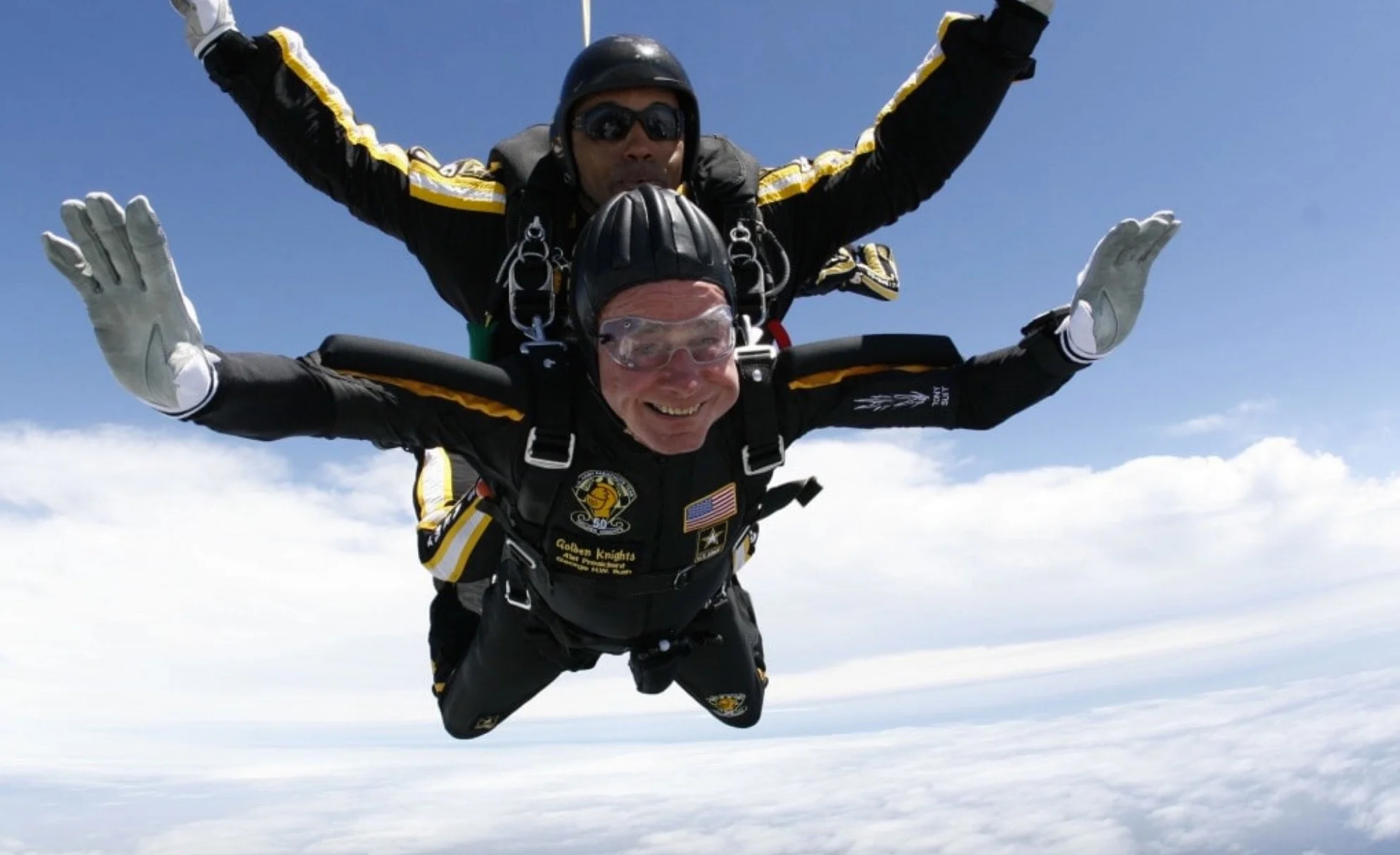 Am 85. Geburtstag erfüllt er sich einen Traum. Mit einem Fallschirm springt er über Kennebunkport, Maine, ab. (Foto: AP/Joe Abeln)