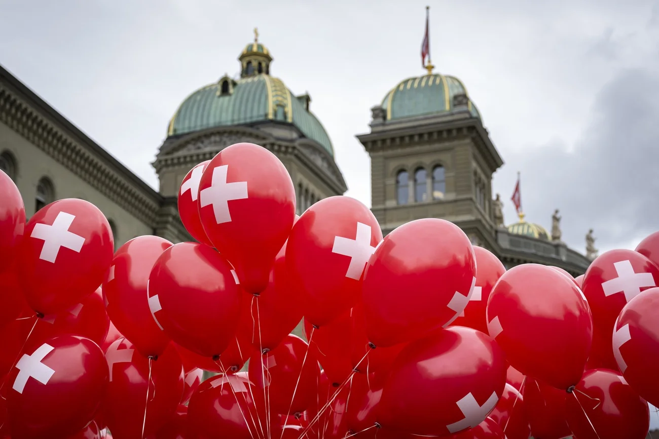Luftballons vor dem Bundeshaus bei einer Aktion der SVP Schweiz zum Kampagnenauftakt gegen Verhandlungen mit der EU, am Dienstag, 12. März 2024 in Bern. (Bild vom 12. März 2024, Keystone, Anthony Anex)
