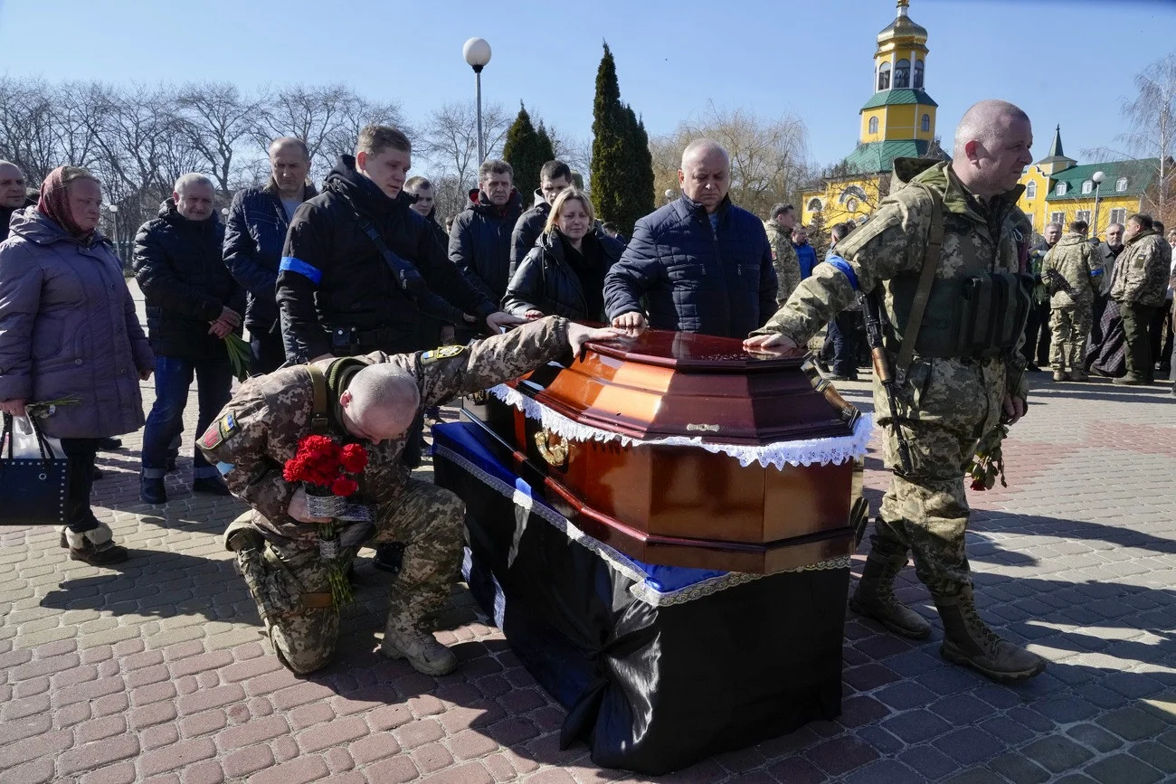 Auf dem Friedhof von Boryspil bei Kiew verabschieden sich Soldaten von Oberst Valertjy Gudz. Er war am Dienstag bei Kämpfen im Südosten der Hauptstadt ums Leben gekommen. Wie viele Opfer der Krieg bisher in der ukrainischen Armee gefordert hat, ist nicht klar. Präsident Wolodimir Selenskyj spricht von 1’500 Toten. Auf russischer Seite sind nach Angaben westlicher Geheimdienstkreise mindestens 4’000 Soldaten ums Leben gekommen. Selenskyj spricht von 12’000.