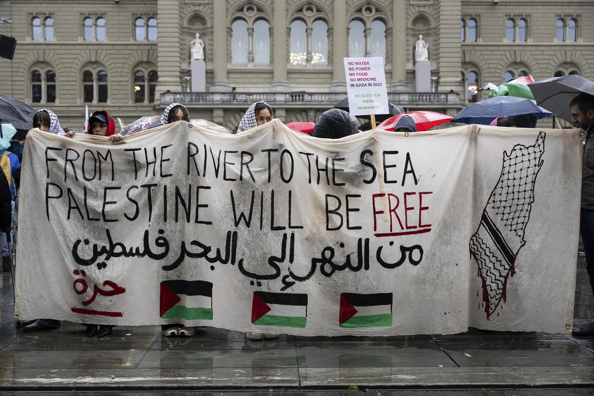Für Israel, auch für die jüdischen Gemeinschaften ausserhalb und somit auch hier in der Schweiz, beinhaltet der Satz, die ganze Region müsse (Analogie zum Sprachgebrauch von Hitlers Nationalsozialisten) «judenfrei» werden, also alle Juden/Jüdinnen würden vertrieben. Palästinenser und Teilnehmer an pro-palästinensischen Kundgebungen argumentieren dagegen, die Parole verlange lediglich, dass das Gebiet zwischen Jordan und Mittelmeer zu einer Demokratie für alle werde, also zu einem Land mit gleichen Rechten für Juden und Palästinenser. Allerdings: Dass die milde Interpretation nicht für jene gilt, die Verständnis für Hamas haben, ist klar, denn Hamas will tatsächlich die ganze Region von Israeli respektive Juden «befreien».