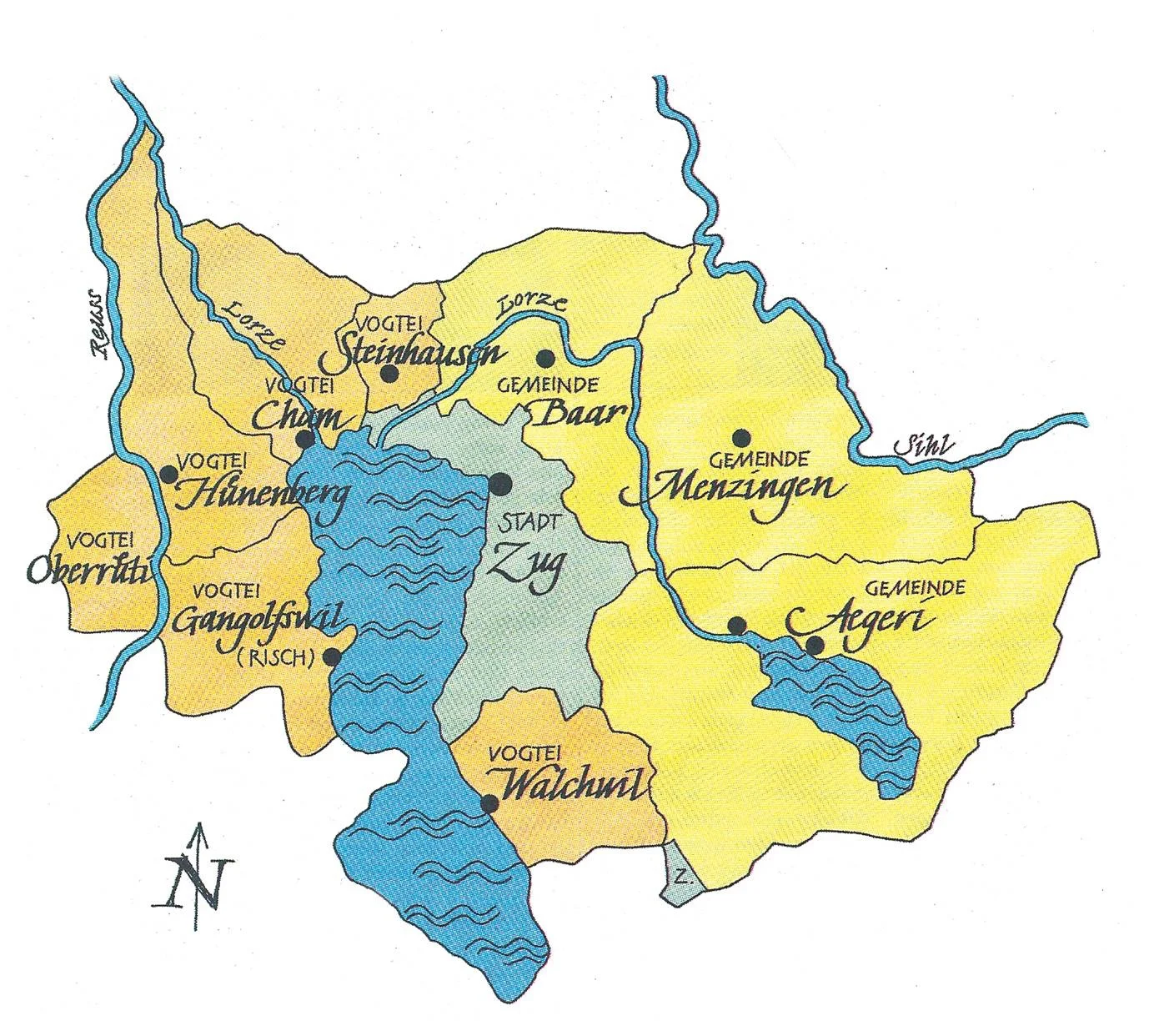 Der Stand Zug als «Kleinstaat im Kleinstaat» widerspiegelt dieses institutionelle Patchwork. So schreibt der Basler Historiker-Journalist Fritz René Allemann in seinem noch heute lesenswerten Buch «25-mal die Schweiz». (1) Auf seinem Mini-Territorium vereinigt Zug das stadtstaatliche und das ländlich-demokratische Prinzip. Es ist ein Staatenbund von vier freien Gemeinden, eine «Confoederatio» der Stadt Zug mit ihren Vogteien sowie der Gemeinden Ägeri, Menzingen und Baar. Die Landsgemeinde hält sie zusammen. Doch zwischen der Stadtgemeinde und den drei freien Landkommunen kommt es immer wieder zu Spannungen um die Vormacht. Fast wäre dieses Gebilde um 1600 zerbrochen – aus politischen Gründen und nicht aus religiösen wie in Appenzell. Ein eidgenössischer Schiedsspruch konnte die Trennung in zwei Halbkantone verhindern.