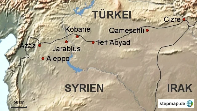 Gegenwärtig stellt sich die Lage an der türkisch-syrischen Grenze so dar: Im Osten herrschen die syrischen Kurden von Qameschli bis über Kobane hinaus über die beiden kurdisch bevölkerten Kantone Cizre und Kobane. Sie beherrschen damit fast drei Viertel der Grenze. Westlich von Kobane und jenseits des Euphrats beginnt das Machtgebiet von IS. Der wichtigste Grenzübergang, den IS noch beherrscht, ist jener des Fleckens Jarablus. Eine knapp 100 Kilometer lange Grenzstrecke bis nach Azaz, nordwestlich von Aleppo, befindet sich im Machtbereich vom IS.