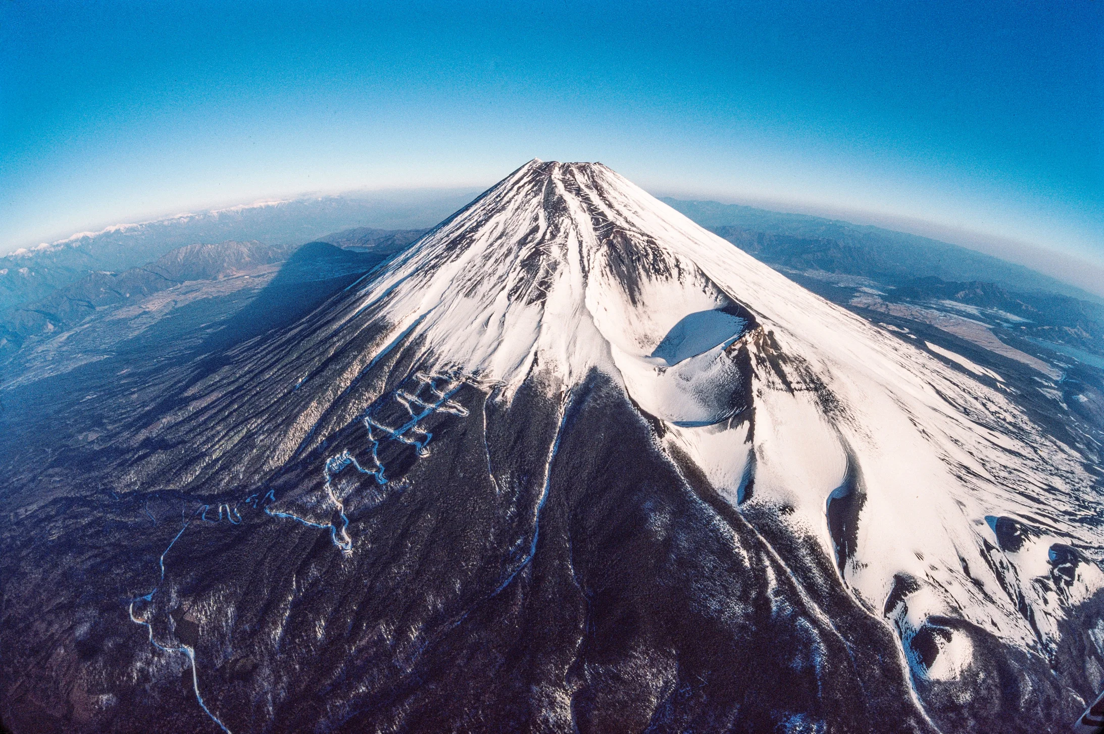 Die Annäherung an den Fuji-san ist für Flugzeuge gefährlich. Seine Fall- und Aufwinde sind gefürchtet. Das hier gezeigte Flugbild machte ich im Januar 1979 an Bord einer einmotorigen Cessna 182; die Neujahrswoche, in der die luftverpestende Industrie abschaltet, war damals eines der wenigen Zeitfenster im Lauf des Jahres, um Fuji-san garantiert in seiner Pracht bestaunen zu können. Wir bezahlten für das Privileg mit lebensbedrohendem Gerüttel und Geschüttel, das Kleinflugzeug drohte auseinaderzubrechen. Eine viel grössere Maschine, eine Boeing 707, war am 5. März 1966 tatsächlich zerbrochen. Auf einem Erdumrundungsflug der British Overseas Airways Corporation (BOAC) wollte der Kapitän seinen Passagieren nach dem Abflug in Tokio den heiligen Berg zeigen. Clear Air Turbulence zerriss die Maschine auf der Abwindseite des Fuji-san, alle 124 Menschen an Bord starben. Ein Jagdbomber der US-Marine, der umittelbar nach dem Absturz zu der Suche nach dem Wrack abhob, geriet in ähnliche Turbulenzen und entging nur knapp dem Schicksal der BOAC-Maschine. – Jahr des Flugbilds: 1979. (Copyright Georg Gerster/Keystone)