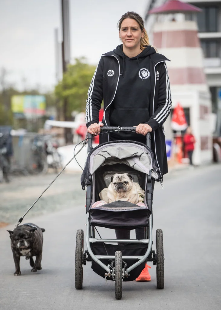 Links läuft noch die elfjährige Frieda, eine französische Bulldogge, an der Leine. Emily ist für einen Mops schon sehr alt und schafft nicht mehr den ganzen Weg zu Fuss. (Foto: Keystone/DPA/Frank Rumpenhorst)