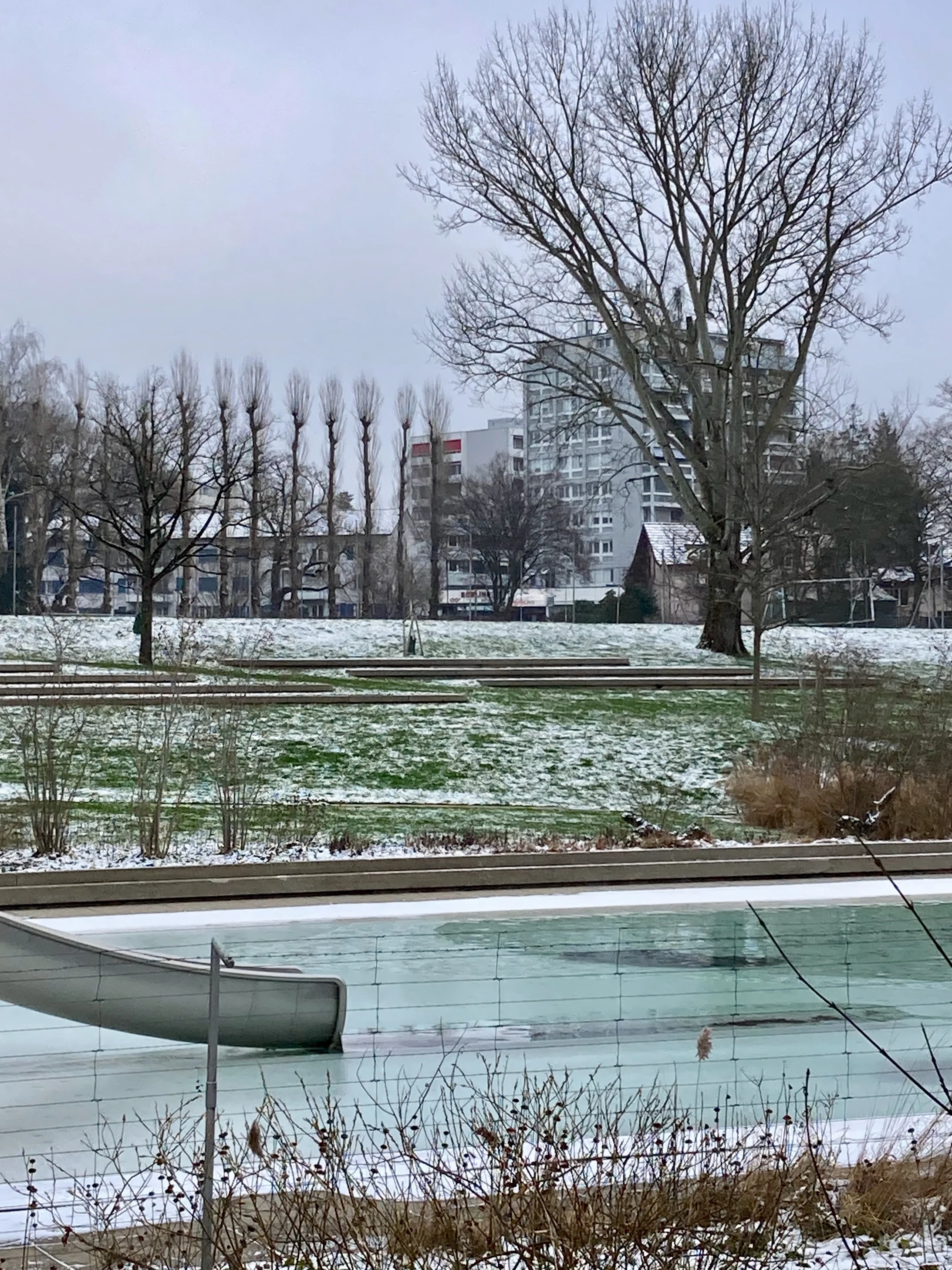 Enttäuscht streiche ich meinen erstes Neujahrsvorsatz von der Liste. Jetzt wäre es schön, in den befahrbaren Tunnel hinunter zu steigen, in welchem die Röhren der Fernheizung Wärme bis ins Hochschul- und Spitalquartier bringen. Stattdessen gehe ich südwärts zu den Gleisen, auf welchen die Züge von Oerlikon nach Wallisellen fahren. Auch hier ist alles neu, gross und nicht gerade naturnah. Nur ein kleines Rinnsal zwischen Bahndamm und Fussweg – es heisst Binzmühlebach, wie ich später auf dem Stadtplan lese – bringt etwas Leben.
