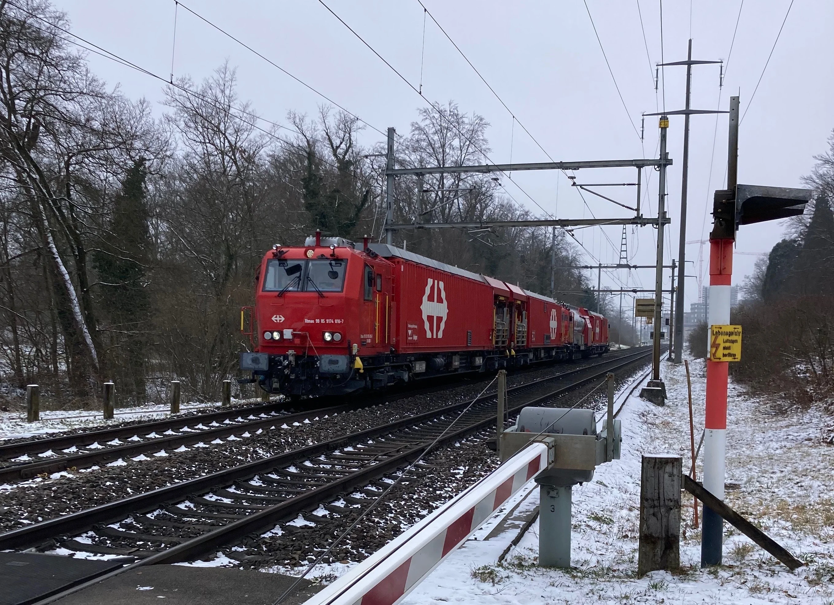 Es soll nicht unerwähnt bleiben: So schön die Landschaft hier auch ist, Lärmempfindliche werden auf meiner heutigen Wanderung während der kommenden zwei Stunden auf eine harte Probe gestellt. Immerhin ist für Abwechslung gesorgt; die Akteure wechseln ständig. Vorerst ist es die nahe Strasse, welche hier mitten durchs Ried führt. Als ich nördlich von Altburg die Bahngleise überquere, beginnt das Andreaskreuz zu lärmen und rot zu blinken. Ich flüchte mich auf die andere Seite und warte dort auf den angekündigten Zug. Beim Näherkommen übertönt er bald den Strassenlärm. Das kann keine S-Bahn sein, sagt der Bähnler in mir. Tatsächlich: Es ist der von einer Diesellokomotive angetriebene rote Hilfszug, der bei Unfällen zum Einsatz kommt. Ich hoffe, es handle sich nur um eine Probefahrt.