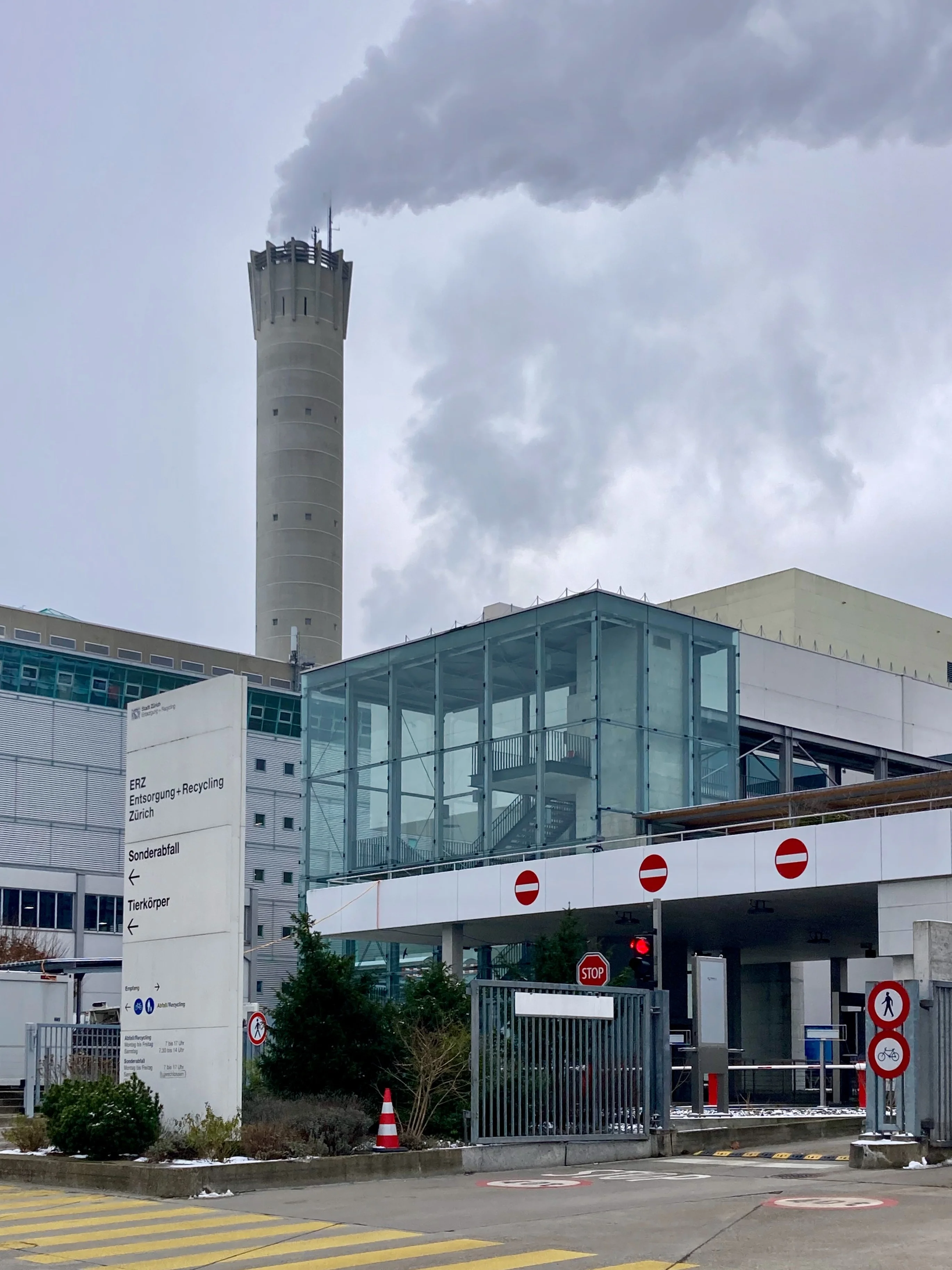 Und immer noch kein Abfallwesen! Was tun? Links stehen die Wohnblöcke des neuen Glattparks Opfikon, rechts prangt ein grosses SRF-Logo an einem fabrikartigen Gebäude … und plötzlich sehe ich ihn, den riesigen Turm, aus dem – wie aus einer überdimensionierten Friedenspfeife – weisser Rauch quillt. Das ist das Zeichen, hier, in dieser gut bewachten Burg muss es sein, das geheimnisvolle Abfallwesen. Doch der Eingang zum Gelände ist streng bewacht, Fussgänger sind nicht erwünscht. An einer weissen Tafel lese ich «Sonderabfall», darunter «Tierkörper» – jetzt fällt es mir wie Schuppen von den Augen: Das Abfallwesen ist entsorgt oder gerecyclet, kurz: Ich komme zu spät.