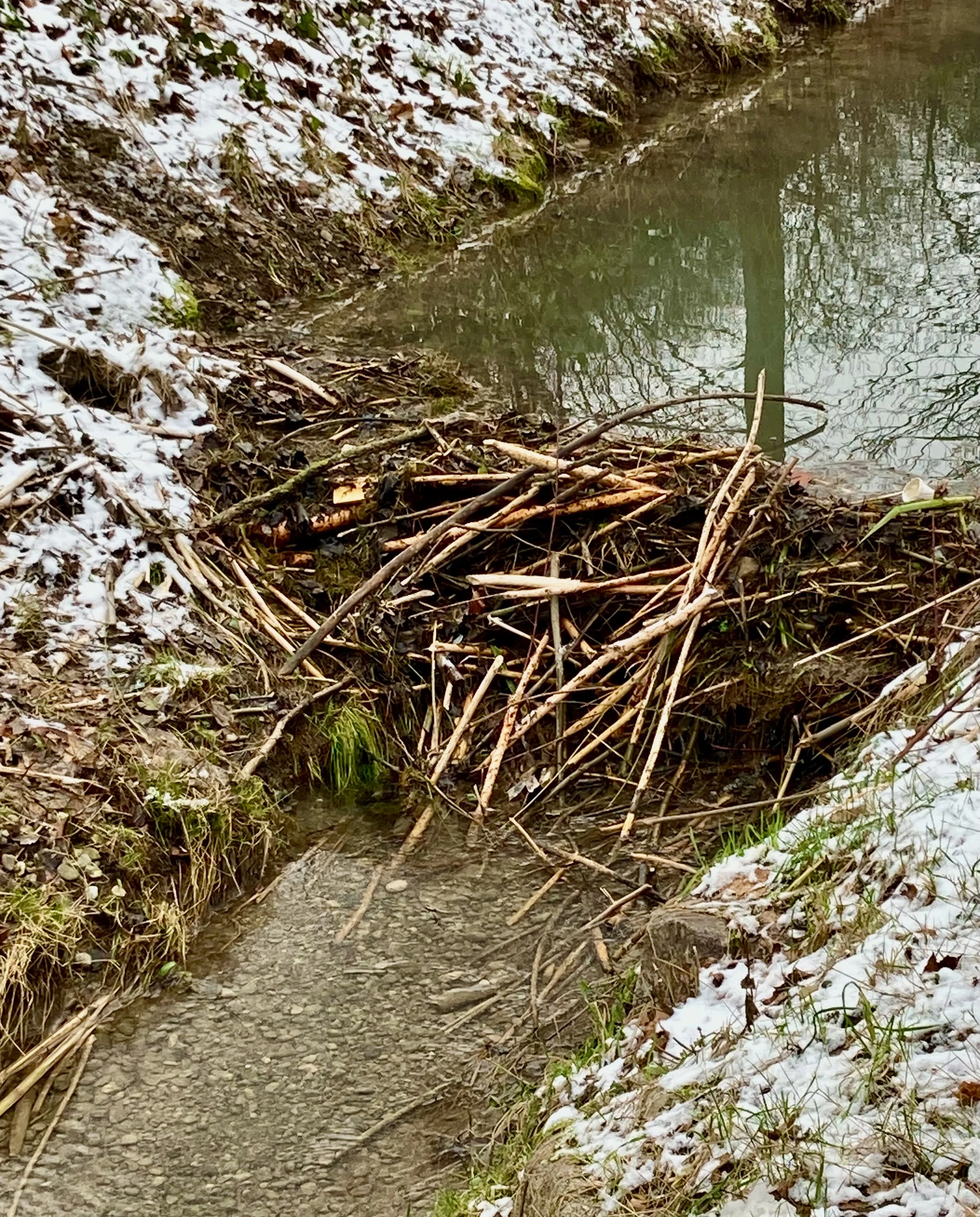 Plötzlich stutze ich. Überall liegen am Bahnbord geknickte Äste, abgenagte kleine Bäume und Büsche, ein richtiges Bioabfall-Eldorado. Und dann die grosse Überraschung. Ein gut gebauter Damm staut den Bach. Das Wasser hat weiter oben eine kleine Anlage, welche wohl für die gestressten Menschen aus Bürohochhäusern gedacht war, überflutet. Es gibt es noch, denke ich, das Abfallwesen, auch wenn es sich als Biber getarnt hat.