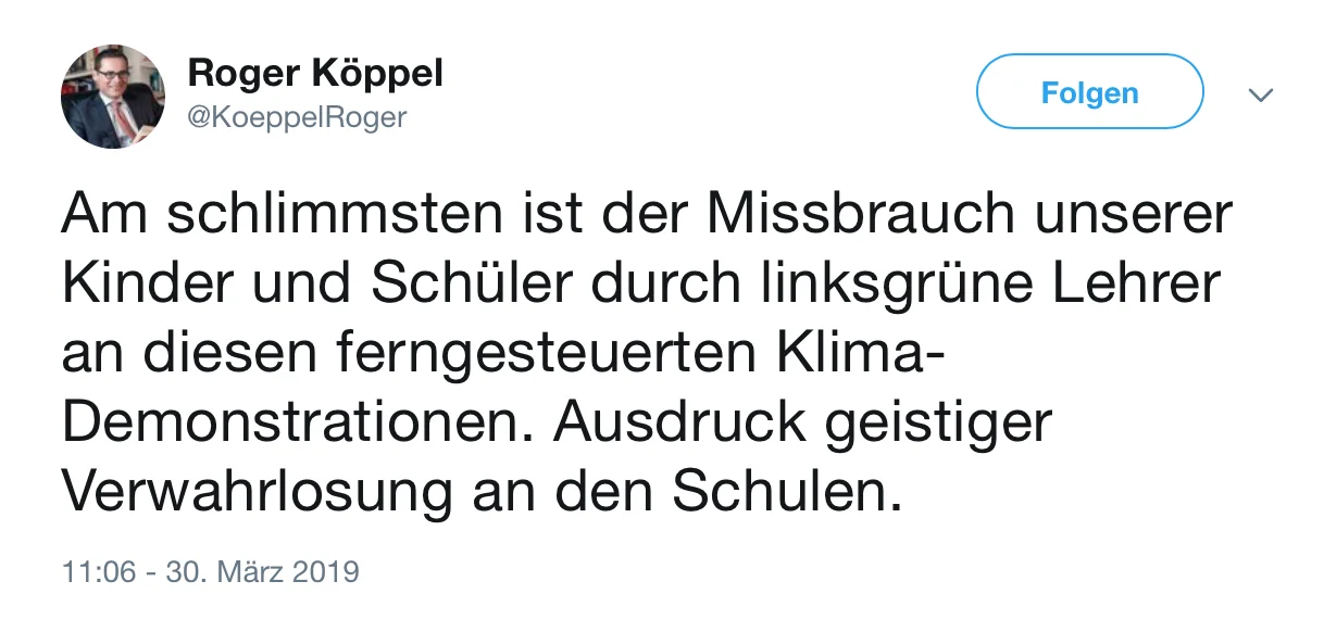 Ähnlich wie in diesem Tweet hat Roger Köppel schon wiederholt getönt. Die demonstrierenden Schüler titulierte er als «Kindersoldaten», er verglich ihre Auftritte mit Kinderkreuzzügen oder Pol Pots Kinderarmeen.