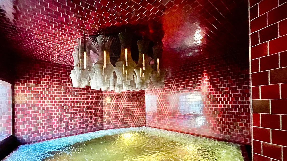 Es entsteht in jeder Kammer eine faszinierende Stimmung, man liegt im Wasser, während die Augen von den Farbklängen auf angenehmste Art angeregt werden. Im Kontrast dazu wurden zwei Ruheräume mit Lärche und Kiefer getäfert; eine Hommage an die Engadiner Stuben. Beginnend in den edel furnierten Umkleidekabinen, erlebt man in diesem labyrinthischen Gefüge auf jedem Stockwerk eine visuelle Überraschung.