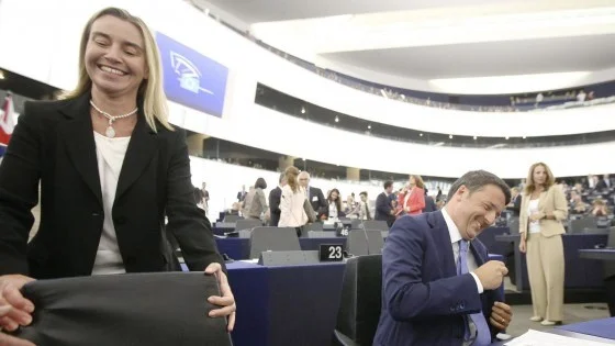 Mit einem Freudenschrei nimmt Italiens Ministerpräsident Matteo Renzi die Wahl seiner Favoritin Federica Mogherini zur EU-Aussenbeautragten zur Kenntnis.