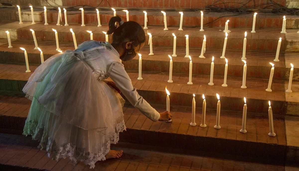 Ein Mitglied der Frauenrechts- und -förderorganisation Naripokkho zündet am 10. Dezember 2021 in Dhaka Kerzen an, um die Toten des Befreiungskriegs von 1971 zu ehren. (Keystone/EPA, Monirul Alam)