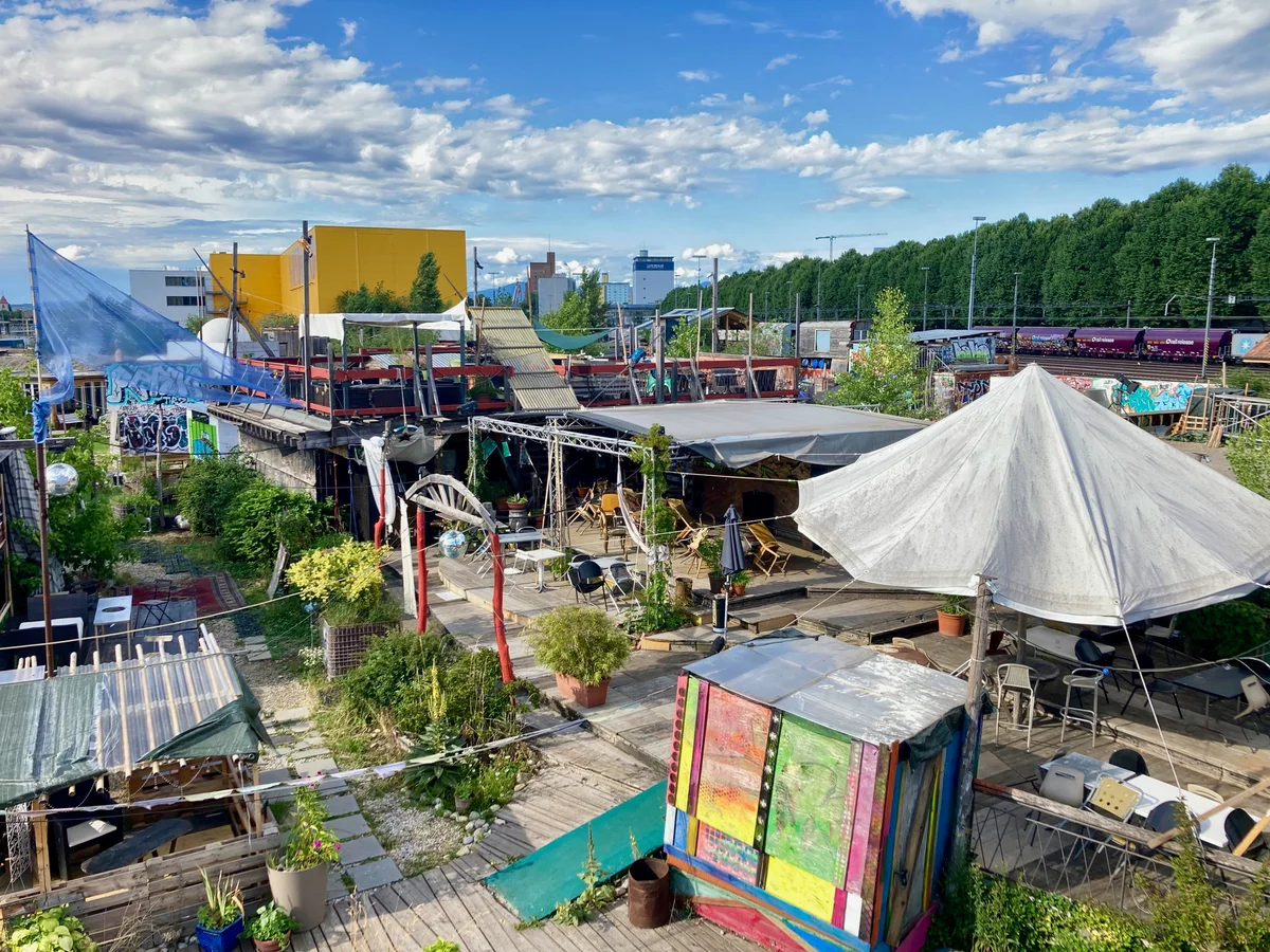 Wie (zwischen-)nutzt man ein kiesbedecktes Gelände von einer Hektare ohne Strom, Wasser und Kanalisation? – Katja (Pflegefachfrau, Kulturveranstalterin, sprachgewandte Moderatorin (3) ) und Tom (Elektriker, Tontechniker, Kulturveranstalter) überzeugten die Stadt, sie wüssten es, erhielten den Zuschlag, fanden Seelenverwandte, begannen 2014 mit dem Ausheben von Gräben für die Ver- und Entsorgung des Geländes, bauten aus Holz provisorische Veranstaltungs- und Verpflegungsstätten (den Hafechäs zum Beispiel, in dem es im Winter Fondue gibt), überzeugten durch ihren schier unerschöpflichen Enthusiasmus andere, mit eigenen Projekten aufs Gelände zu kommen, waren manchmal erschöpft und verzweifelt, gaben aber nie auf, auch wenn die benachbarten Geländebesetzerchaoten immer wieder neu Geschaffenes zerstörten, bis sie sich schliesslich mit den vermeintlichen Konkurrenten abfanden.