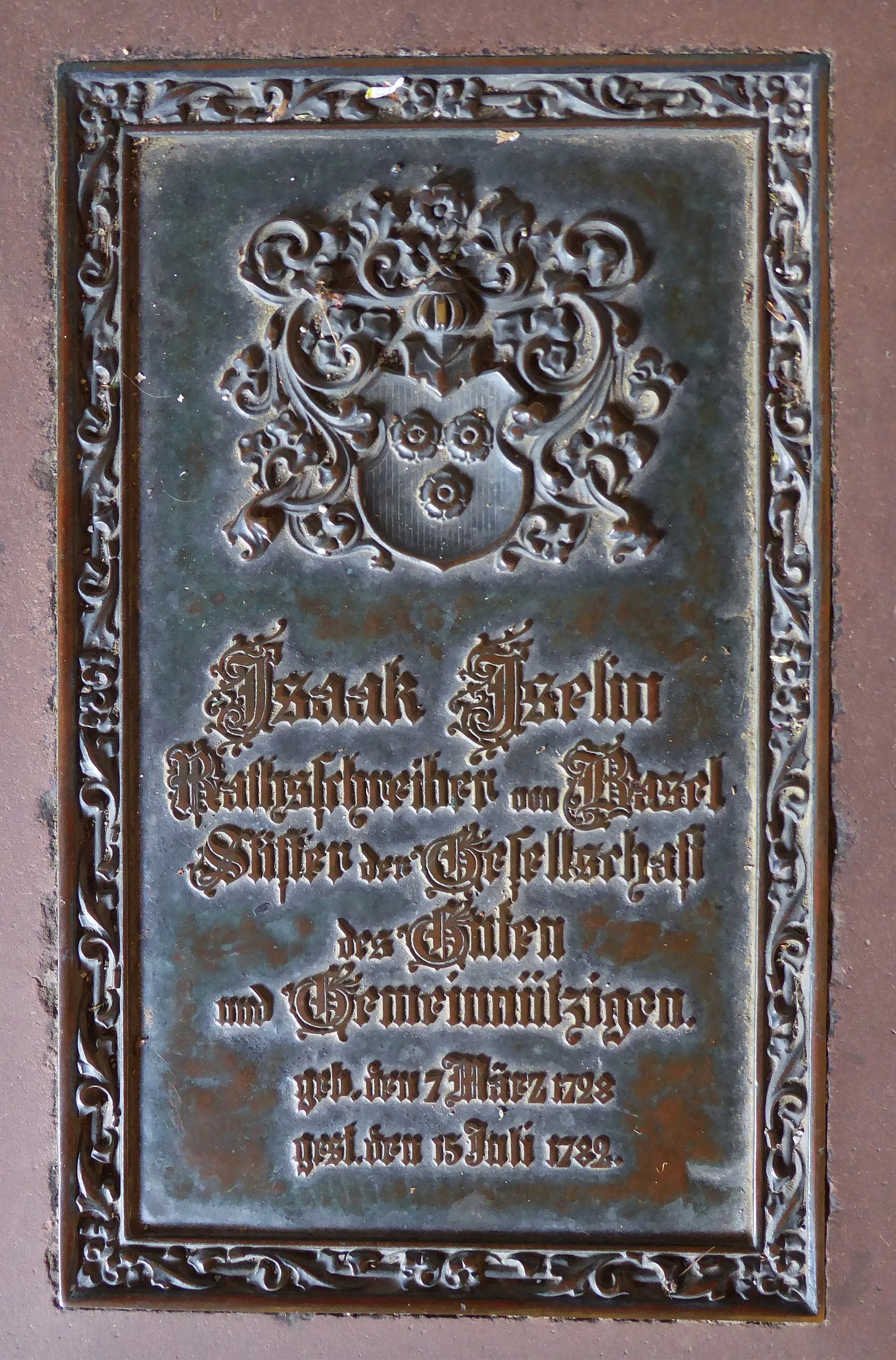 Im Kreuzgang des Basler Münsters hängt die Grabtafel von Isaak Iselin (1728–1782), «Rathsschreiber von Basel, Stifter der Gesellschaft des Guten und Gemeinnützigen», bekannt unter dem Namen «GGG». Das Familienwappen der Iselins zieren drei Rosen. Iselin studierte Philosophie und Jurisprudenz und wäre gerne in Basel Professor geworden, doch blieb ihm diese Ehre zeitlebens versagt.