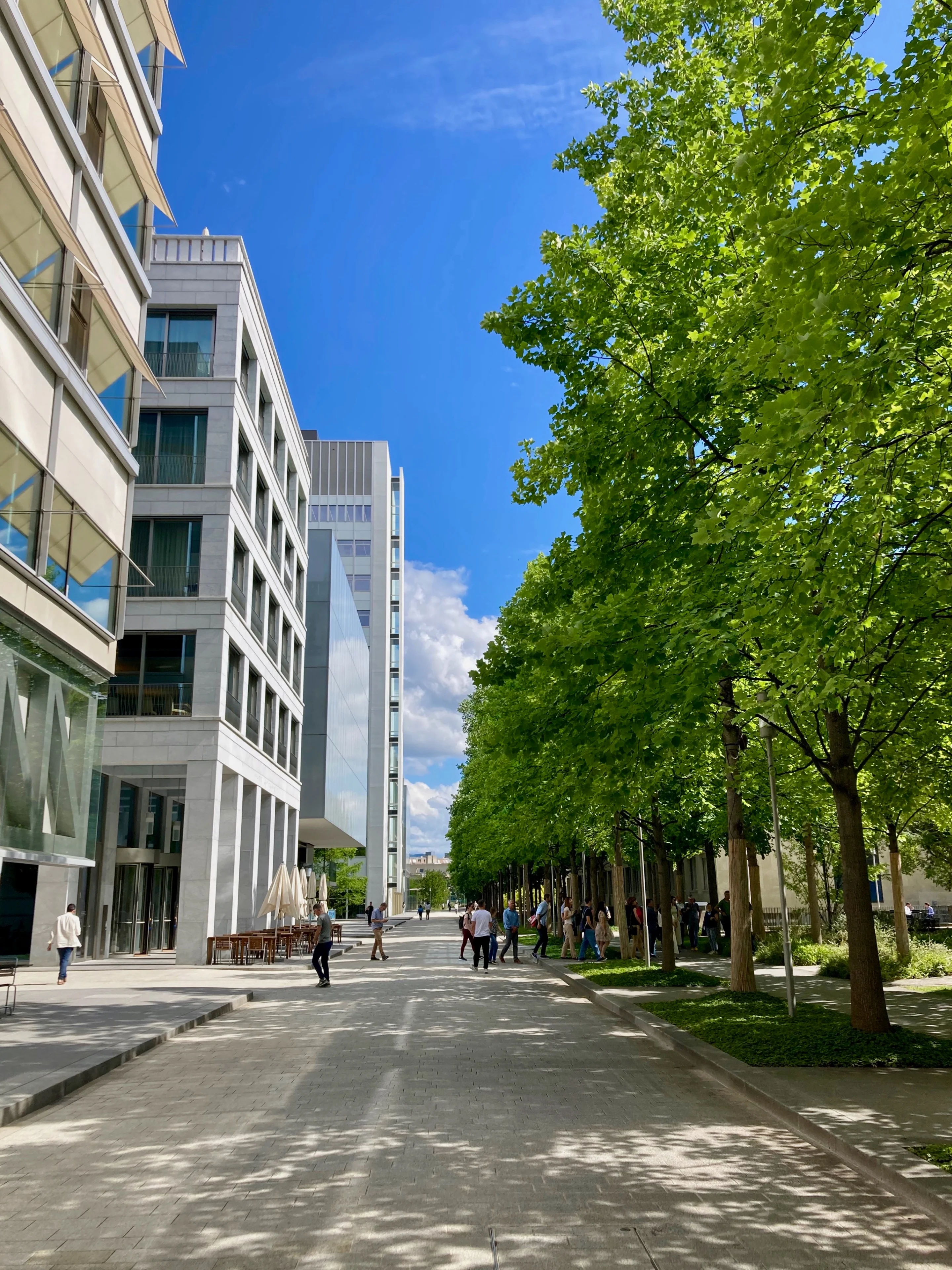 Verschiedene berühmte Architekten, darunter (natürlich) die Basler Herzog & de Meuron, David Chipperfield, Eduardo Souto de Moura und Yoshio Taniguchi, haben in das von Lampugnani entworfene klassische rechteckige Strassenmuster ihre Gebäude gesetzt, so dass man sich auf der als Allee gestalteten einstigen Fabrikstrasse tatsächlich in einer klassischen Stadt mit einladenden Innenhöfen wähnt, in denen man sich – zumindest während der warmen Jahreszeit – gerne für Gespräche über die Fachgrenzen hinaus niederlässt.