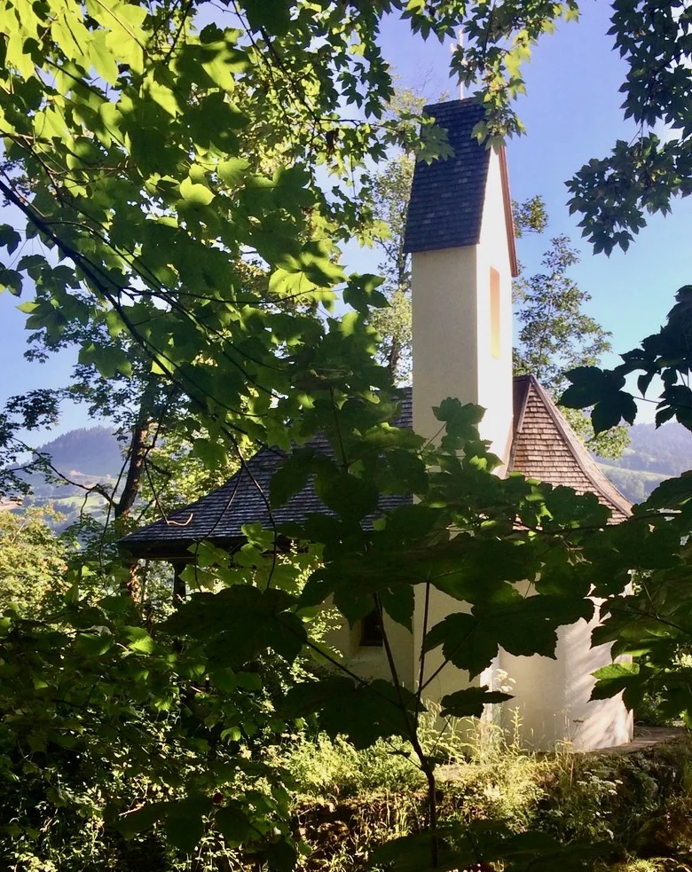 Soweit lasse ich es nicht kommen, überquere die Thur und folge ihr abwärts. Ein Wäldchen spendet Schatten. Zwischen den Zweigen wird der schmale Turm der Kapelle sichtbar, die an der oberen Spitze einer kleinen Flussinsel steht. Eine gedeckte Holzbrücke führt hinüber, aber ein Schild mit der Aufschrift „Privatbesitz Johanneum“ veranlasst mich, auf eine Besichtigung der Inseli-Kapelle zu verzichten.