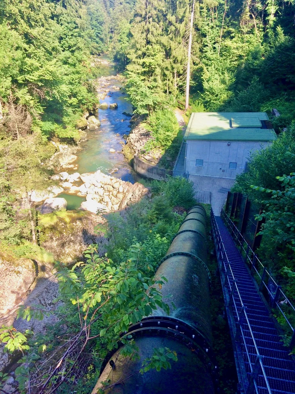 Auf der Rückseite des Gebäudes führt die mächtige Druckleitung zum Maschinenhaus hinunter, flankiert von einer steilen Treppe, auf der ich zum Fluss gehe. Bis zum Bahnhof von Ebnat-Kappel wäre es nur noch knappe fünf Kilometer, alles dem Fluss entlang und bergabwärts. Aber ich hätte die Karte genauer studieren sollen: Tatsächlich gleicht der Weg einer Achterbahn. Einmal geht es auf steiler, mit alten Bahnschwellen gebauter Treppe hinunter zum Fluss, dann wieder aufwärts an den Rand der Geländekante, welche die Schlucht von den Wiesen trennt, auf denen weidende Kühe ihre Glocken bimmeln lassen.