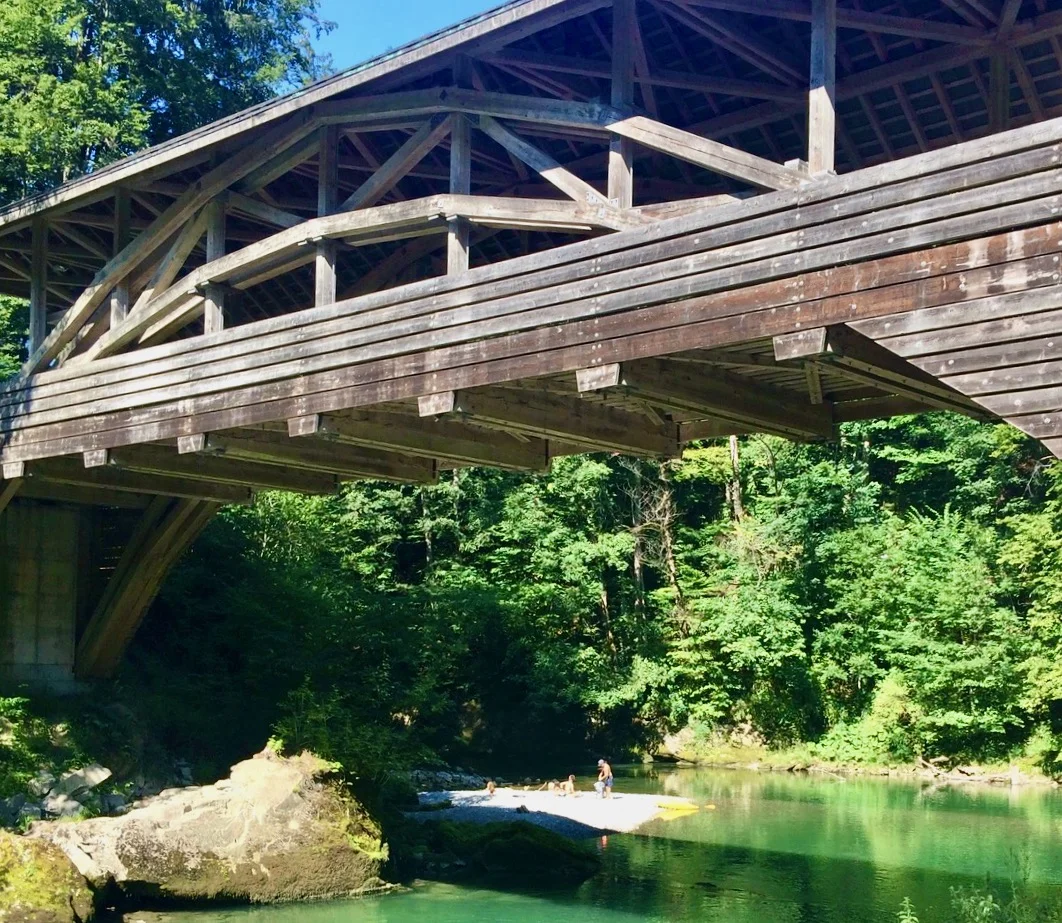 Und tatsächlich, durch die Bäume sehe ich eine Strasse, welche zu einer Holzbrücke führt. Auf einer Kiesbank im Fluss hat sich eine Familie niedergelassen, ein Paddelboot liegt angebunden im Wasser. Das kleine Strässchen führt an der linken Talseite zum Brandholz hinauf. Das Restaurant Blume sei geöffnet, verkündet ein Schild, aber ich widerstehe der Verlockung. Es soll am Nachmittag 35 Grad werden, also will ich rechtzeitig in Ebnat-Kappel den Zug für die Heimfahrt erreichen.