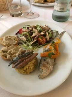 Die Osteria ist bekannt für ihre Fischgerichte, ganz besonders für den Missoltino, einen sardellen-sardinen-ähnlichen Süsswasserfisch aus den südalpinen Seen der Lombardei. Zu Deutsch Maifisch, wird er heute vor allem aus dem Comersee geholt, in kleinen Pressen vom allzu reichlichen Öl befreit, getrocknet und ist so das ganze Jahr zur Aufbereitung fertig, ähnlich wie der „stoccafisso“ (Stockfisch), der getrocknete Dorsch aus Norwegen. Sehr gut schmeckt er bei den Lafranconis zur Vorspeise als Aufstrich auf dünnen Scheibchen getrockneten Brots und vom Grill mit Polenta. Wie traditionsreich der kleine Fisch ist, zeigen Fresken und Mosaiken in romanischen Kirchlein der Region, erzählt Gabriele, und ein Maifischfest im Juli! Im regionalen Dialekt heisst er Missultitt.