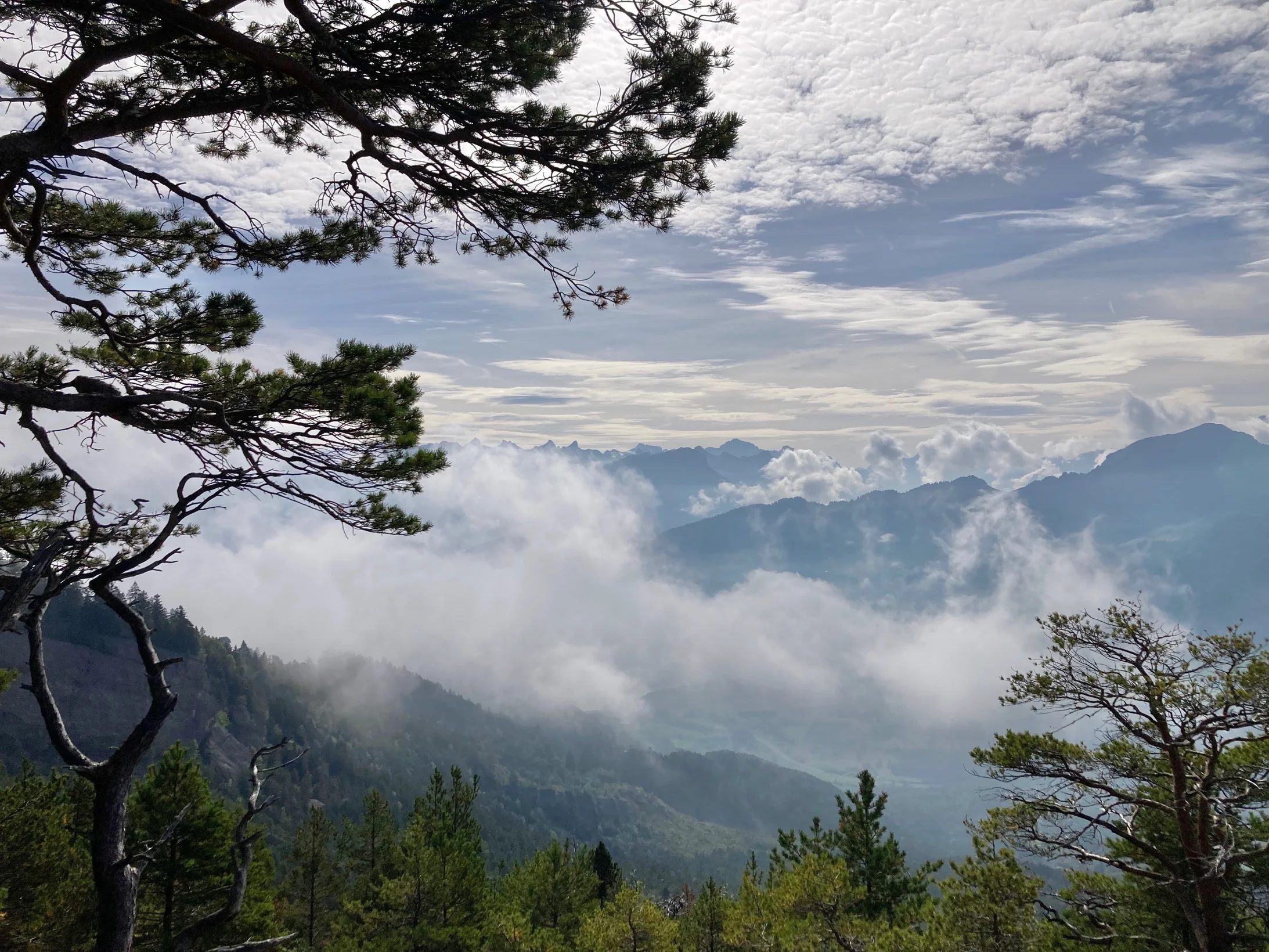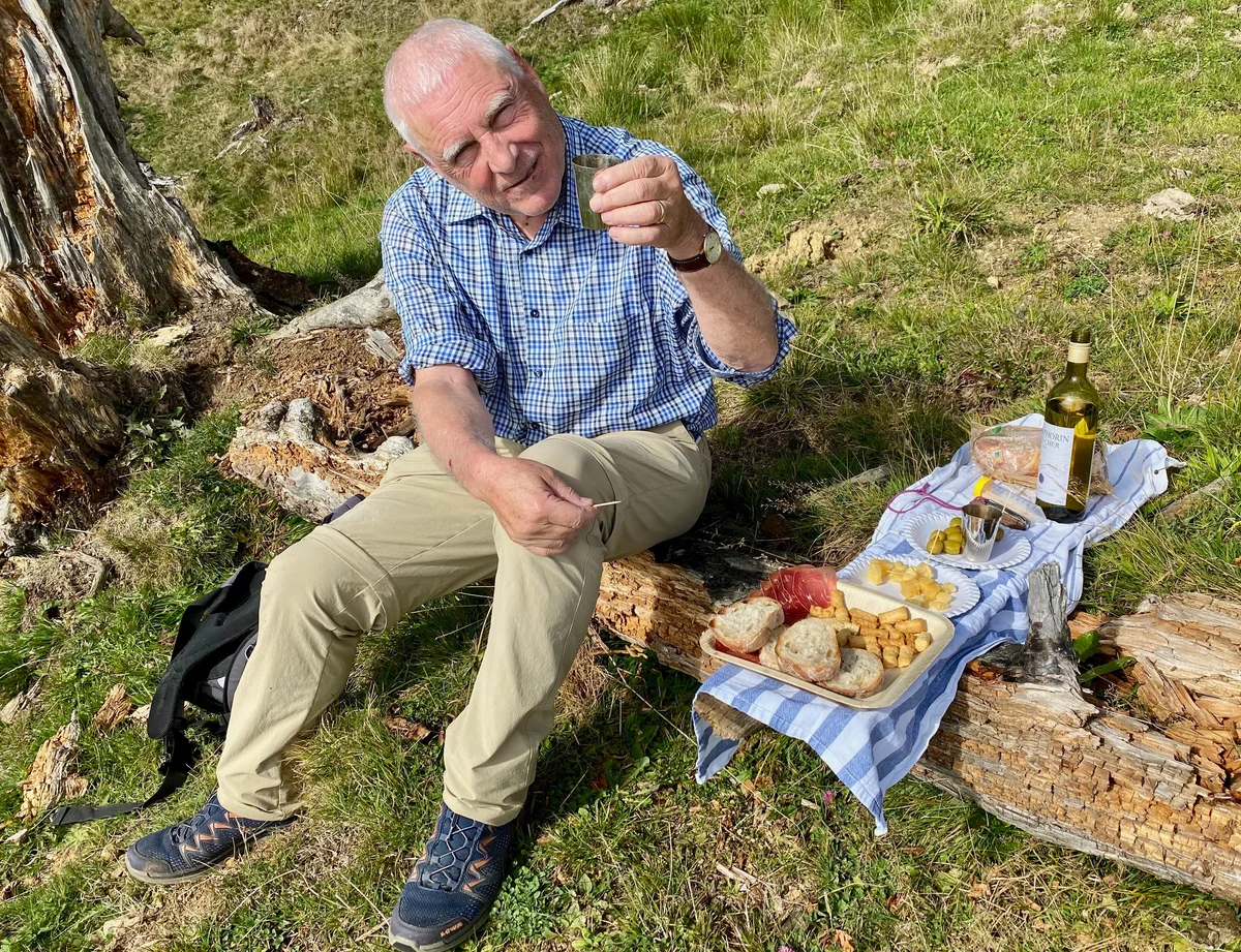 Vor lauter Steinen hätten wir beim Aufstieg fast den Himmel vergessen. Auch hier ist einiges in Bewegung: Von Süden her schiebt der Föhn Wolken heran, verhüllt den Talkessel von Schwyz und die Mythen, aber schliesslich gewinnt der blaue Himmel im Norden den Kampf. Auch der Kampf meines achtzigjährigen Herzes gegen die Höhenkurven endet gut; der Aufstieg fällt mir leichter als befürchtet. Plötzlich bleibt der Bergwald zurück; der Blick wird frei auf den Zuger- und Ägerisee. Oberhalb der eindrücklichen Abrisskante gehen wir das kurze Stück zum Gnipen. Weitere zwei Kilometer ostwärts, auf dem Wildspitz, gäbe es eine Beiz, aber dank Sepps kluger Planung sind wir autonom. Wir suchen uns ein Plätzchen auf der Alpwiese, wo Sepp auf einem improvisierten Tisch unser Gipfelmahl serviert, zu dem selbstverständlich auch der Gipfelwein gehört.