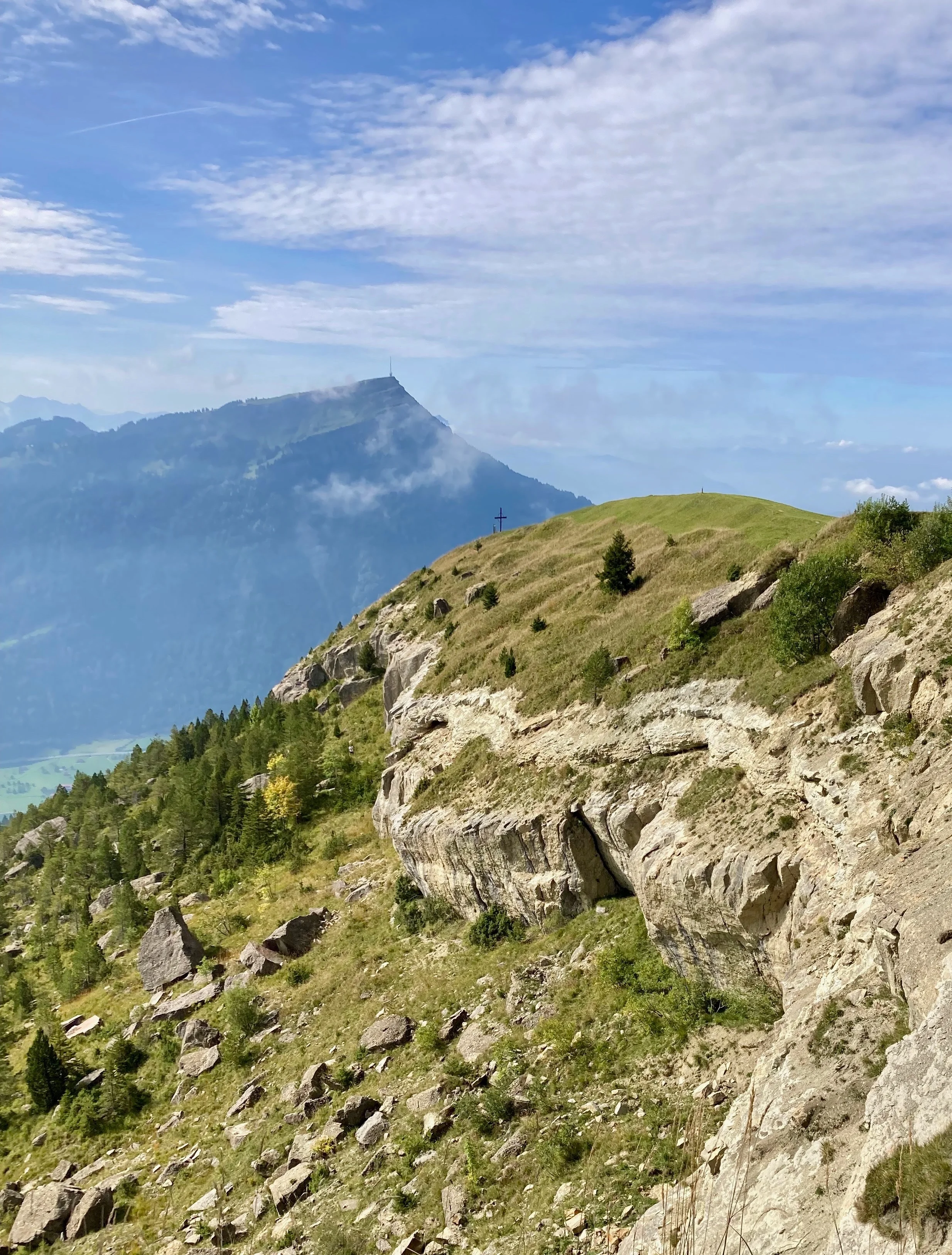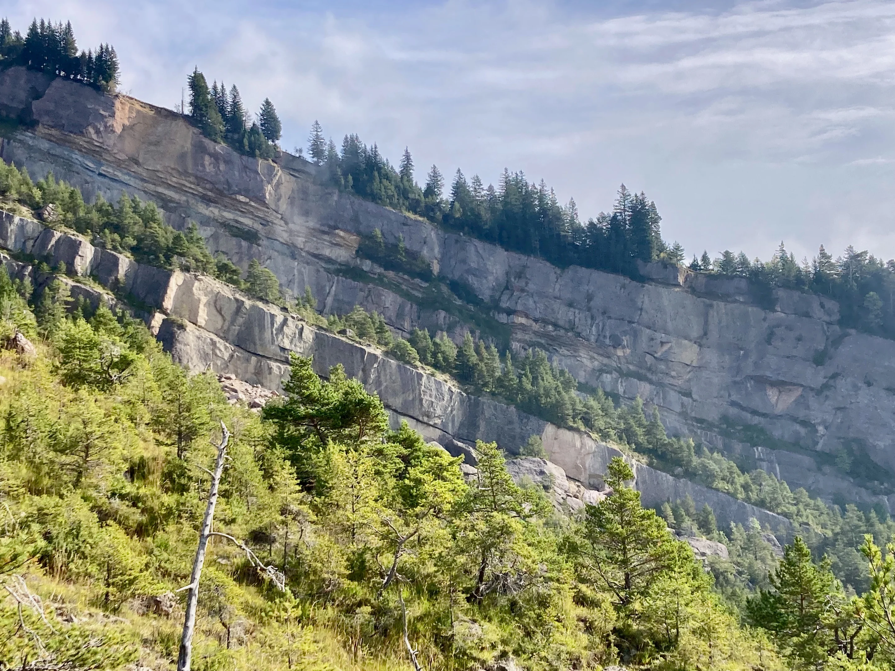 Für den Abstieg wählen wir den Weg entlang der östlichen Begrenzung des Bergsturzes. Hier haben die bis 70 Meter mächtigen abgerutschten Schichten eine imposante Felskante hinterlassen. Um meine Knie zu schonen, habe ich für einmal Stöcke mitgenommen – eigentlich hasse ich sonst dieses Hilfsmittel. Auf der schiefen Rossbergplatte geht es munter und rasch der Falllinie entlang ins Tal.