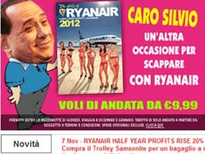 Am Schluss muss er auch für den Spott nicht mehr sorgen. Im italienischen Parlament wurde am Dienstag eine Werbebroschüre der Fluggesellschaft Ryanair verteilt. Darauf sieht man, wie Berlusconi einen Reisekatalog in den Händen hält. Darauf sind einige halbnackte Frauen an einem fernen Strand zu sehen. Der Text dazu lautet: Lieber Silvio, eine weitere Gelegenheit, mit Ryanair abzuhauen. Hinflug: 9 Euro 99.