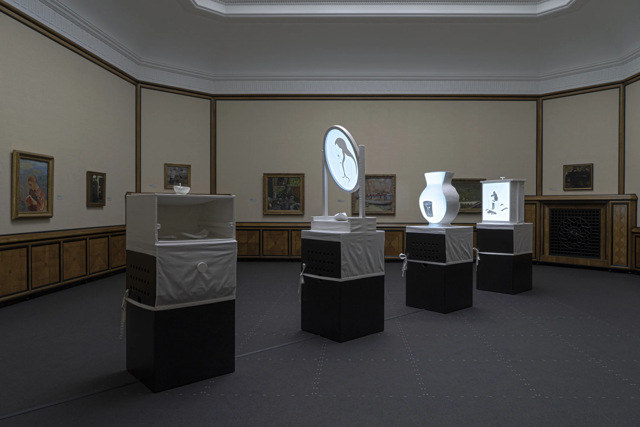 Yves Netzhammer (*1970): Nistplätze für Berührungen, 2006, Video- und Objektinstallation mit Sockel, Stoff, Keramik, 150 Zeichnungen; Schenkung Barbara und Eberhard Fischer; © Kunst Museum Winterthur, Foto: Reto Kaufmann