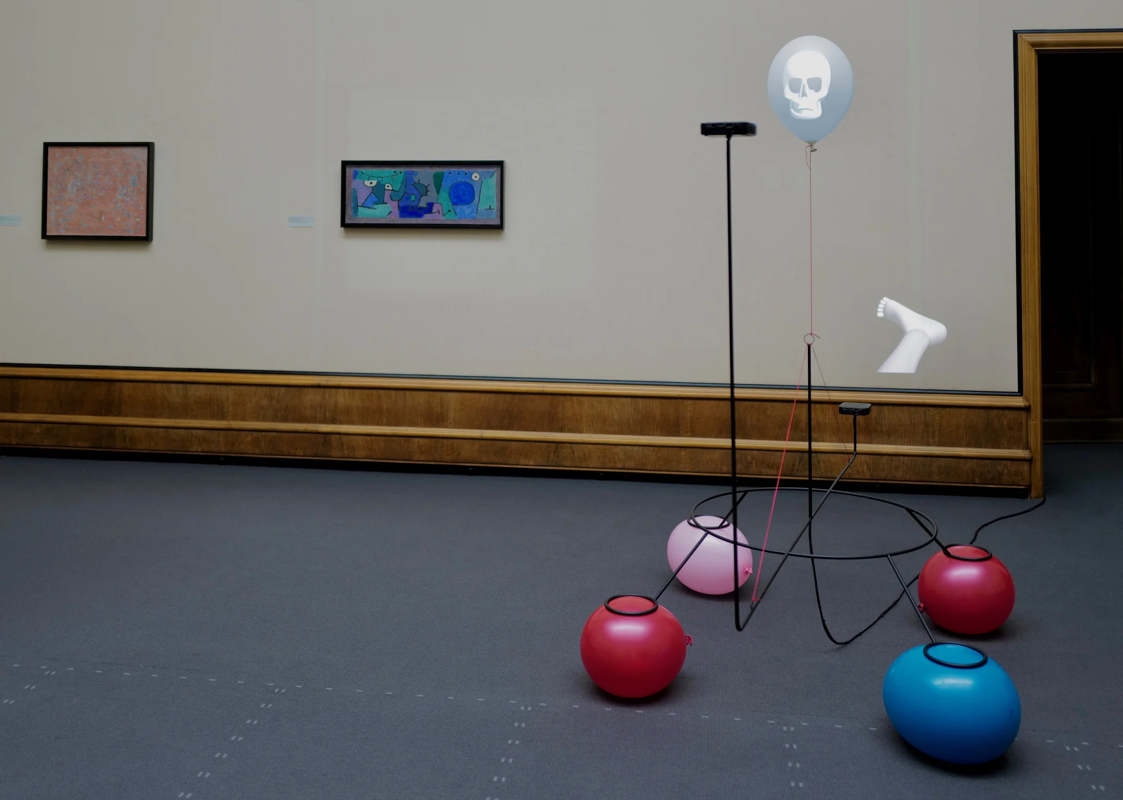Das Gebilde balanciert auf vier Ballonen und wird von einem heliumgefüllten weiteren Ballon hochgezogen. Zwei Mini-Projektoren werfen Zyklen von computergenerierten Objektbildchen auf den schwebenden Ballon und an die Wand, wobei die Putzigkeit der Projektionen immer wieder im Kontrast zu den mit ihnen konnotierten Bedeutungen steht. Bei den wiederholt aufscheinenden Totenköpfen und Gummibooten sind harmlose Lesarten ja zumindest nicht naheliegend. Gleichwohl sind die Irritationen aufgehoben im Staunen angesichts des konstruktiven Raffinements und der fragilen Eleganz des Objekts.