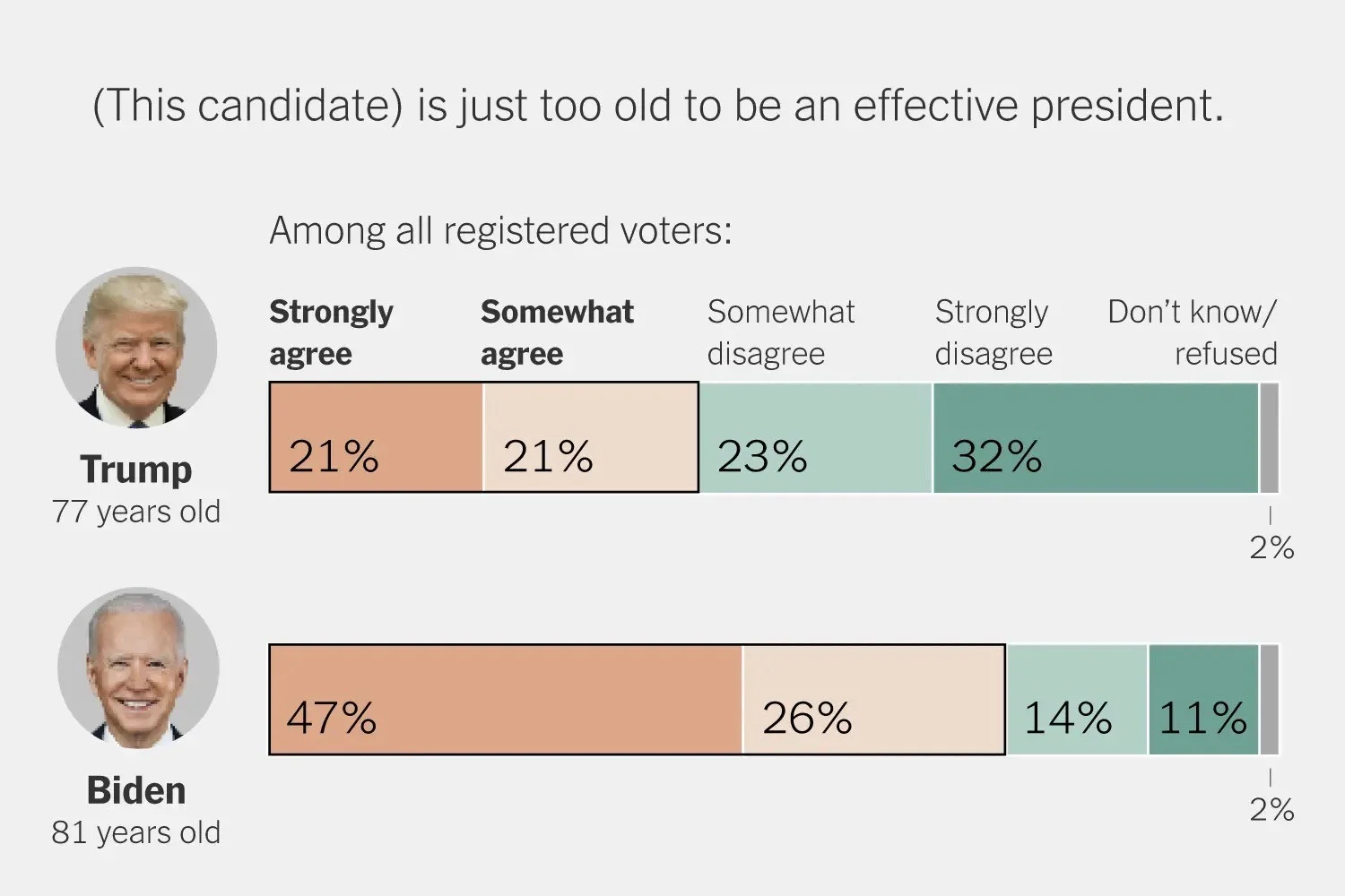 Gemäss der Umfrage sind 47 Prozent fest der Überzeugung («strongly agree»), dass der 81-jährige Biden für das Amt zu alt ist. Weitere 26 Prozent sind mehr oder weniger («somewhat agree») dieser Ansicht.