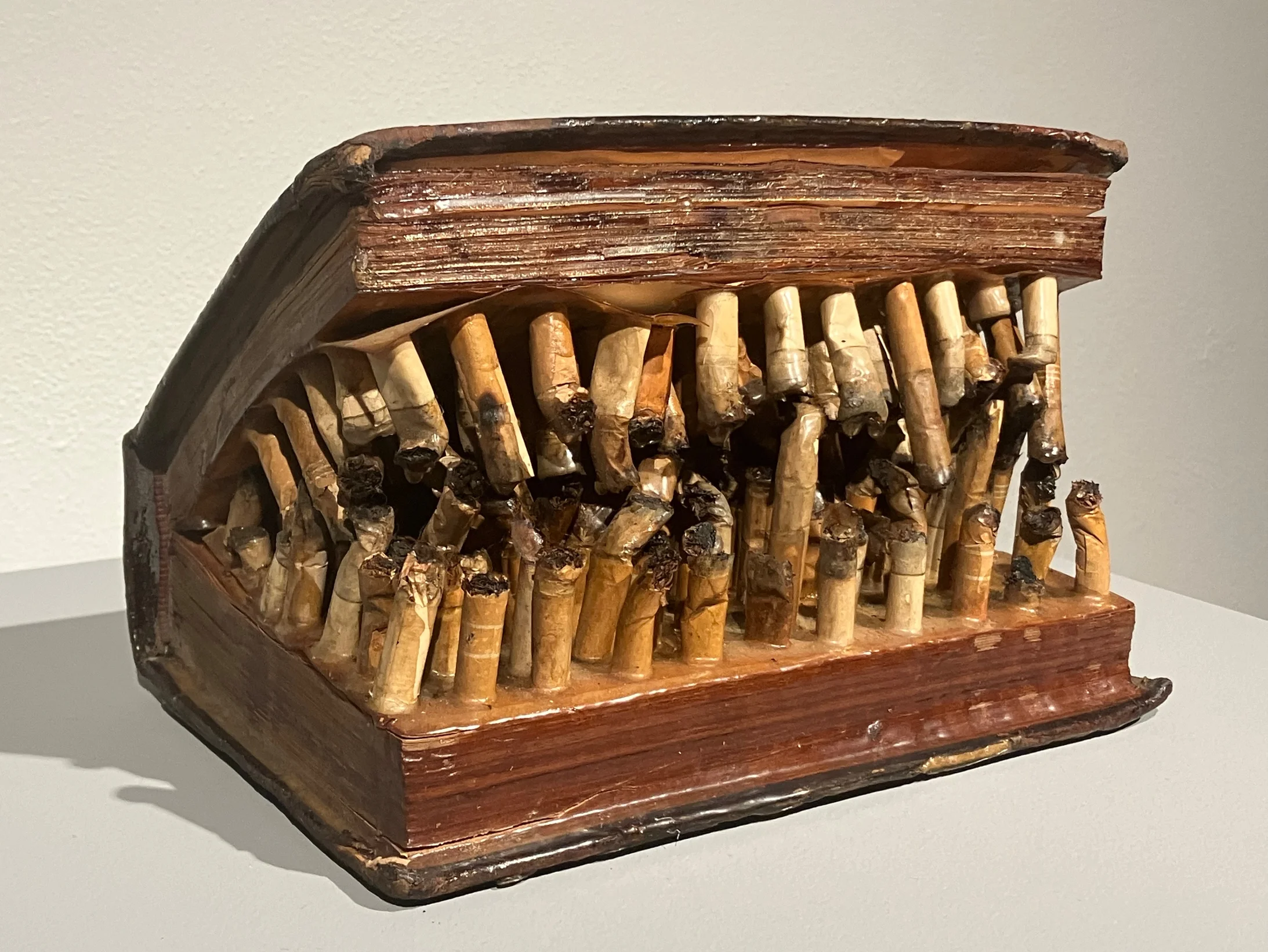 Der Blick geht aber bis in die Zeit vor der Documenta 5 zurück und beginnt mit den «Verstummelungen», mit einer Gruppe von Objekten, die sich anderen Lebensspuren als jenen von Armand Schulthess widmen, aber immerhin auch Lebensspuren – nämlich Zigarettenstummeln, die auf ihre Weise von gelebter Zeit erzählen und zu witzigen und zugleich hintergründigen Wortspielen um «Stummel» und «stumm» Anlass geben können, und die, wenn denn die Künstlerin all die Zigaretten selbst geraucht hat, auch eine persönliche Note ins Spiel bringen. Eines dieser Objekte hat die Form eines halb geöffneten Buches und scheint drohend die Zähne zu blecken (Bild oben).