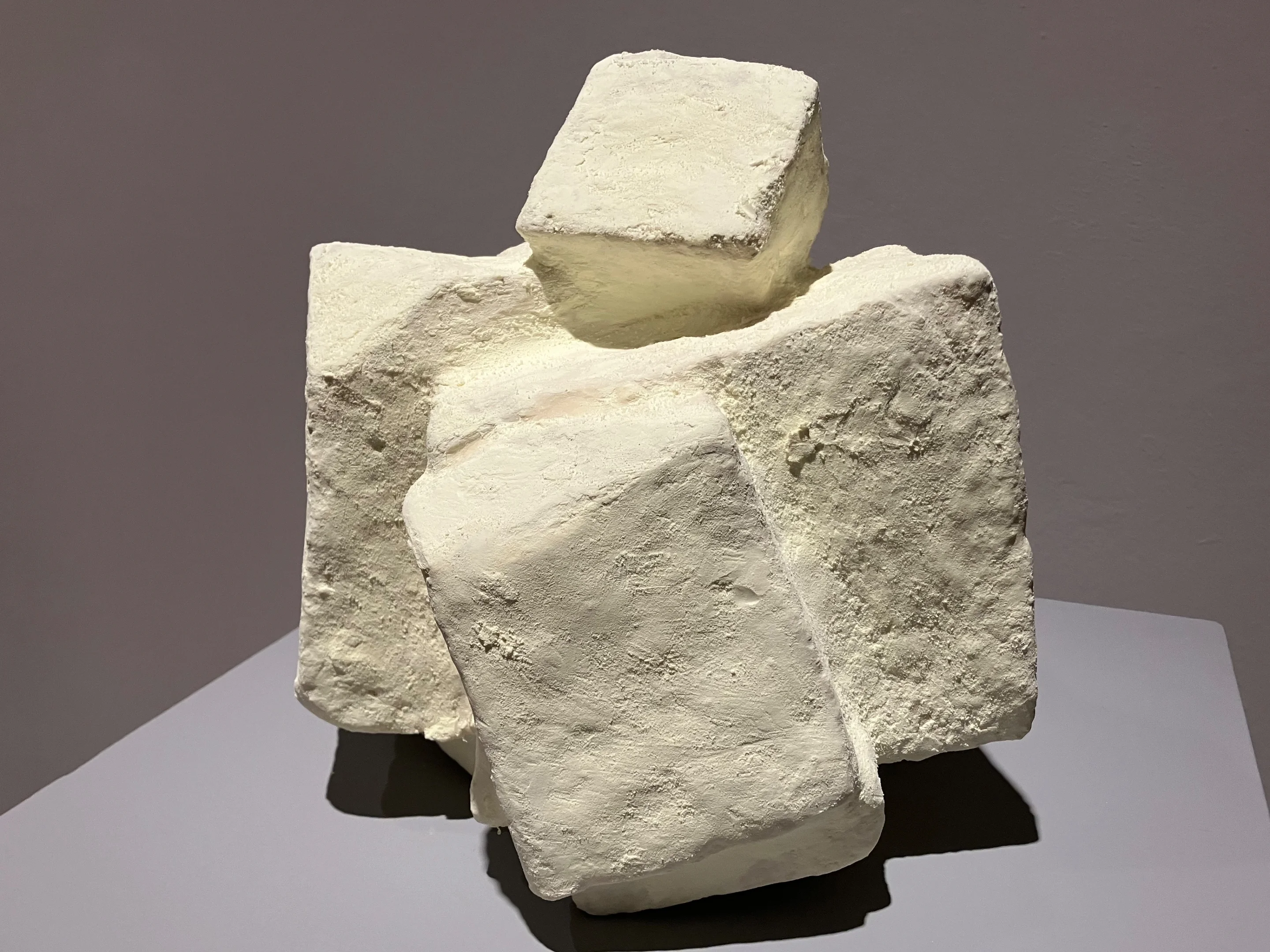 In den 1980er Jahren entdeckte Ingeborg Lüscher in einer Locarneser Apotheke das Material Schwefel, das sie wegen seiner Leuchtkraft, wegen seiner allgemeinen Beschaffenheit samt seinem Geruch zu einer ganzen Serie von Werken anregte – zu Kleinskulpturen mit meist kompakten weichen Formen, aber auch zu einer ganzen Folge von grossformatigen Malereien, in denen sie Schwefel anderen Materialien, zum Beispiel Asche, gegenüberstellte.