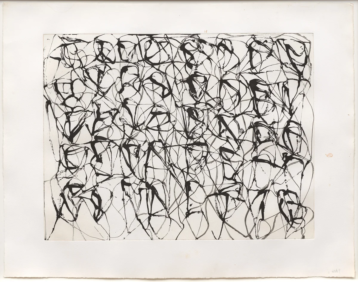 Es wundert nicht, dass Brice Marden mit fernöstlicher Kalligraphie und der Kultur des Zen eine innere Verwandtschaft empfindet. In seinen Tuschezeichnungen lehnt er sich auch technisch an kalligraphische Verfahren an. Mitte der 80er-Jahre setzt seine Cold-Mountain-Serie ein: getuschte Blätter, die sich an Gedichte des Chinesen Han-Shan anlehnen, der während der Tang-Dynastie (619–907) tätig war. In Basel ist eine stattliche Reihe dieser Zeichnungen zu bewundern. Sie alle folgen dem Bau der Gedichtvorlagen und weisen einen Raster von acht vertikalen und fünf horizontalen Reihen auf. In diese Gitterstruktur zeichnet Marden seine an Schriftzeichen gemahnenden Tuschefiguren ein, mal separiert, dann wieder verbunden in einem organischen Geschlinge von Ligaturen, sodass die vorgegebene Ordnung kaum mehr zu erkennen ist.