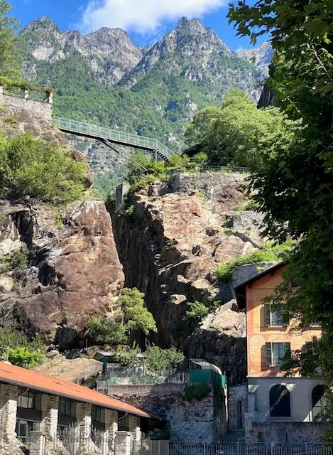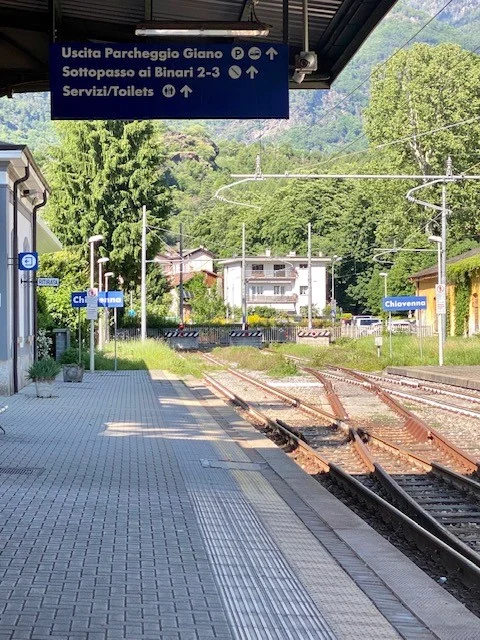Chiavenna ist für den Reisenden, der nach einer langen Fahrt über den Comersee in Colico den Zug bestiegen hat, vorerst nur ein Name in weisser Schrift auf blauem Grund. Stellen wir uns vor, dieser habe weder Zeit noch Lust gehabt, vorher einen Reiseführer zu studieren. Noch etwas benommen, weil er ein paar Mal eingenickt war und ihn der Schaffner schliesslich wachrütteln musste, steht er nun unvermittelt auf einem Bahnsteig, an dessen Ende ein Prellbock die Worte des Schaffners zu unterstreichen scheinen: „Nein, mein Herr, hier enden die Schienen, wenn Sie ins Engadin wollen, müssen Sie sich nach einem andern Verkehrsmittel umsehen.“