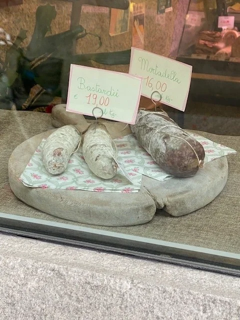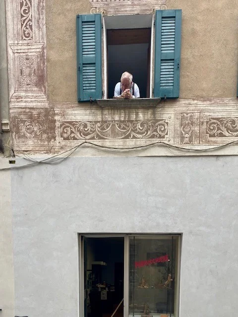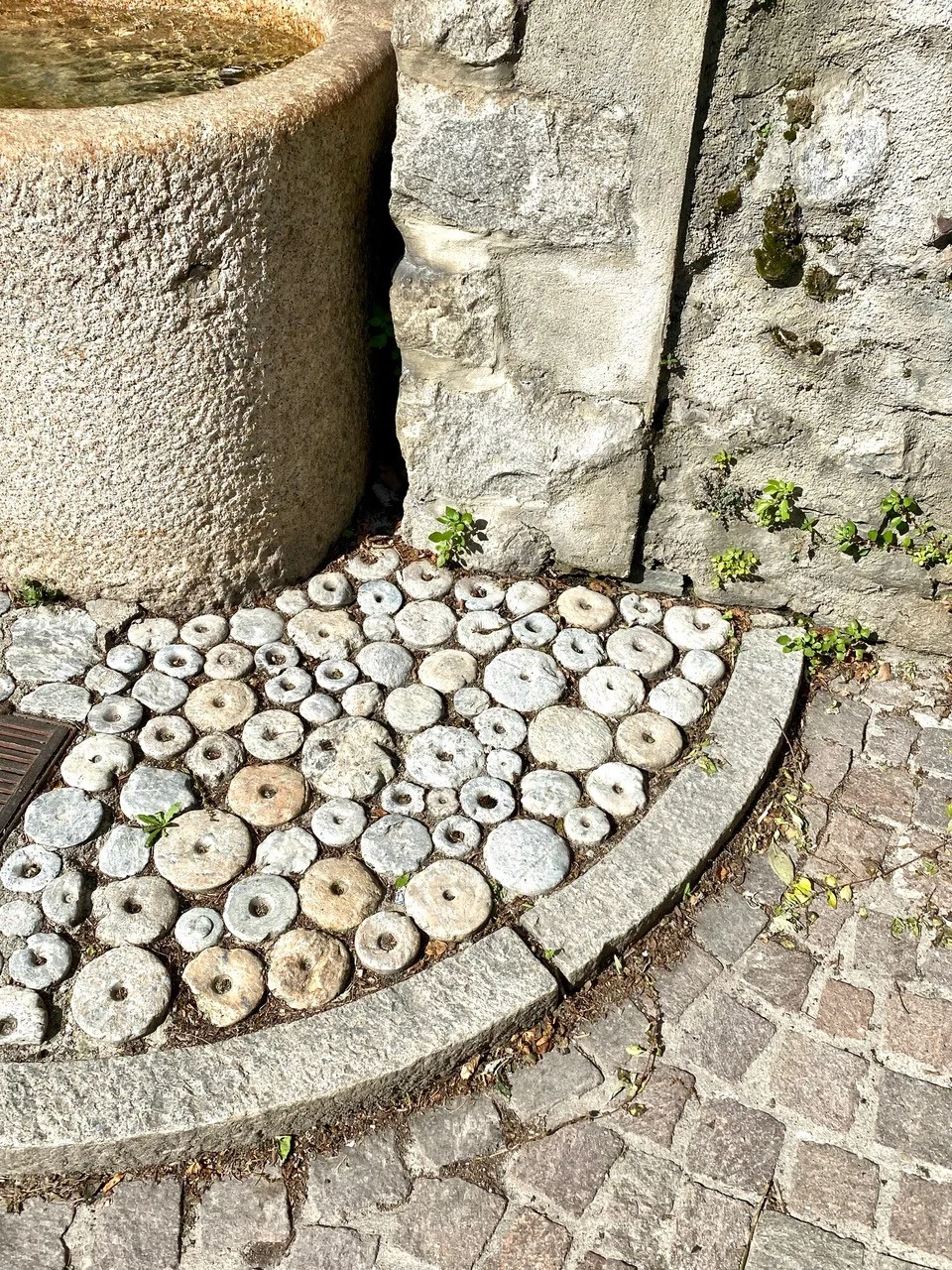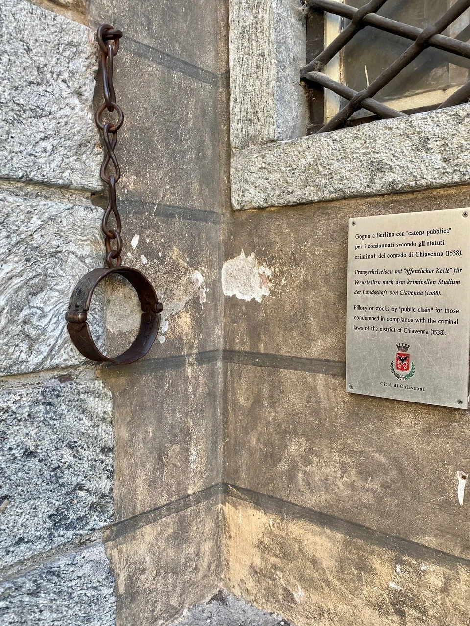 Auf der Suche nach der Hauptgasse wird er von oben kritisch beobachtet. Vor einem Kleidergeschäft sitzen, bewegungslos und mit gestrecktem Rücken, zwei Frauen. Das Schaufenster eines Metzgers erinnert ihn daran, dass er hungrig ist, doch da lockt ihn eine enge Pforte, welche auf den mit Bollensteinen gepflasterten Platz führt und deren Geheimnis er gerne genauer ergründen möchte. Die seltsam geformten Pflastersteine vor einem alten Brunnentrog weckt seine Neugierde: Runde Steine mit einem Loch in der Mitte. Er wird sie später im Garten des Palazzo Vertemate wieder antreffen und dort erfahren, dass es Abfallprodukte aus den Specksteinmanufakturen sind, denen Chiavenna und vor allem das einstige Piuro einen Teil ihres Reichtums verdanken.
