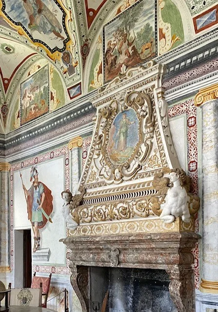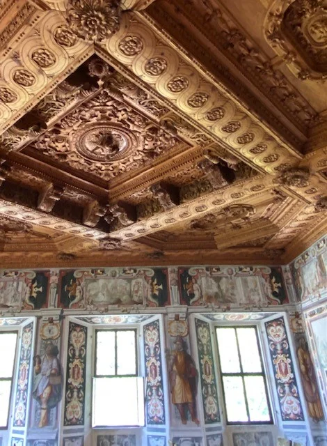 Bemerkenswert sind schon die Wände des Eingangsbereichs, auf denen – wie in einem Gästebuch – wichtige Besuche festgehalten sind. Der älteste Schriftzug trägt das Datum 1619. Die üppig ausgemalten Zimmer erzählen Geschichten aus der Antike. Es gibt das Zimmer von Jupiter und Merkur, des Perseus, des Napoleons, der Signora Maria Eva Sala, es gibt das Amorzimmer und das Zimmer Junos, das auch untere Stüva genannt wird.