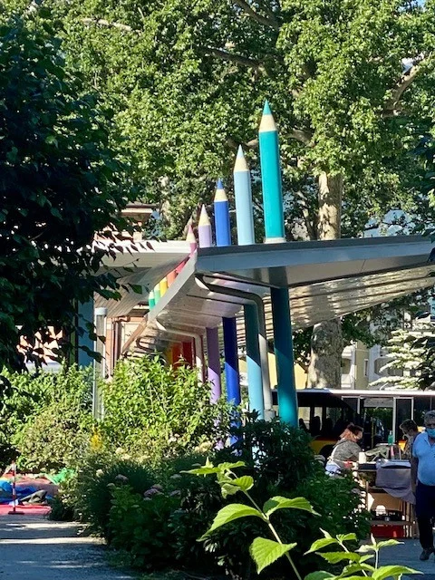 Neben einer Bar weist ein blaues Schild, das an der Wand lehnt, den Betrachter daraufhin, die „Servizi/Toilets“ seien irgendwo oben im Himmel. Gegenüber trägt eine Reihe überdimensionierter Farbstifte das Dach einer Art Bushaltestelle: Von Türkis bis Grau gehen die Farben, als ob sie das Spektrum des Himmel ausloten wollten. Ein Stück weiter zaubert die Sonne einen Zebrastreifen auf die Strasse, der sich irgendwo verliert. Unser Freund folgt ihrem Ruf und erblickt sie schliesslich in einer schmalen Gasse, ein geheimnisvolles Lächeln auf den Lippen, an einem mächtigen Quaderstein eines Hauses. Sie mahnt ihn an das Emblem, mit dem jener Ort, den er auf seiner Reise zu erreichen gehofft hatte, in der ganzen Welt auf sich aufmerksam macht.