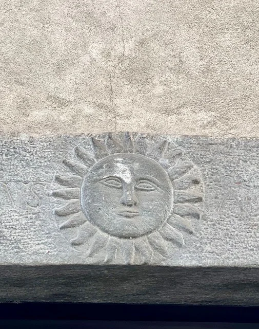 Wir aber, mein kultureller Inspirator Norbert und ich, sind unterdessen ein Stück das Tal der Mera hinauf Richtung Malojapass gefahren und stehen nun unweit des einstigen Piuro beim Eingang des Palazzo Vertemate Franchi. Heute ist die kleine Tür zum Büro für Besucher offen. Weil wir einige Minuten zu spät sind, befürchten wir, die Zehnuhr-Führung sei schon unterwegs, doch unsere Angst ist unbegründet, wir sind die einzigen Gäste. Wir hätten uns wegen Covid-19 vorher anmelden sollen, informiert uns der Verantwortliche freundlich – wie wir später erfahren, ist er von Beruf Geigenbauer, aber schon seit Jahrzehnten im Palazzo Vertemate tätig.