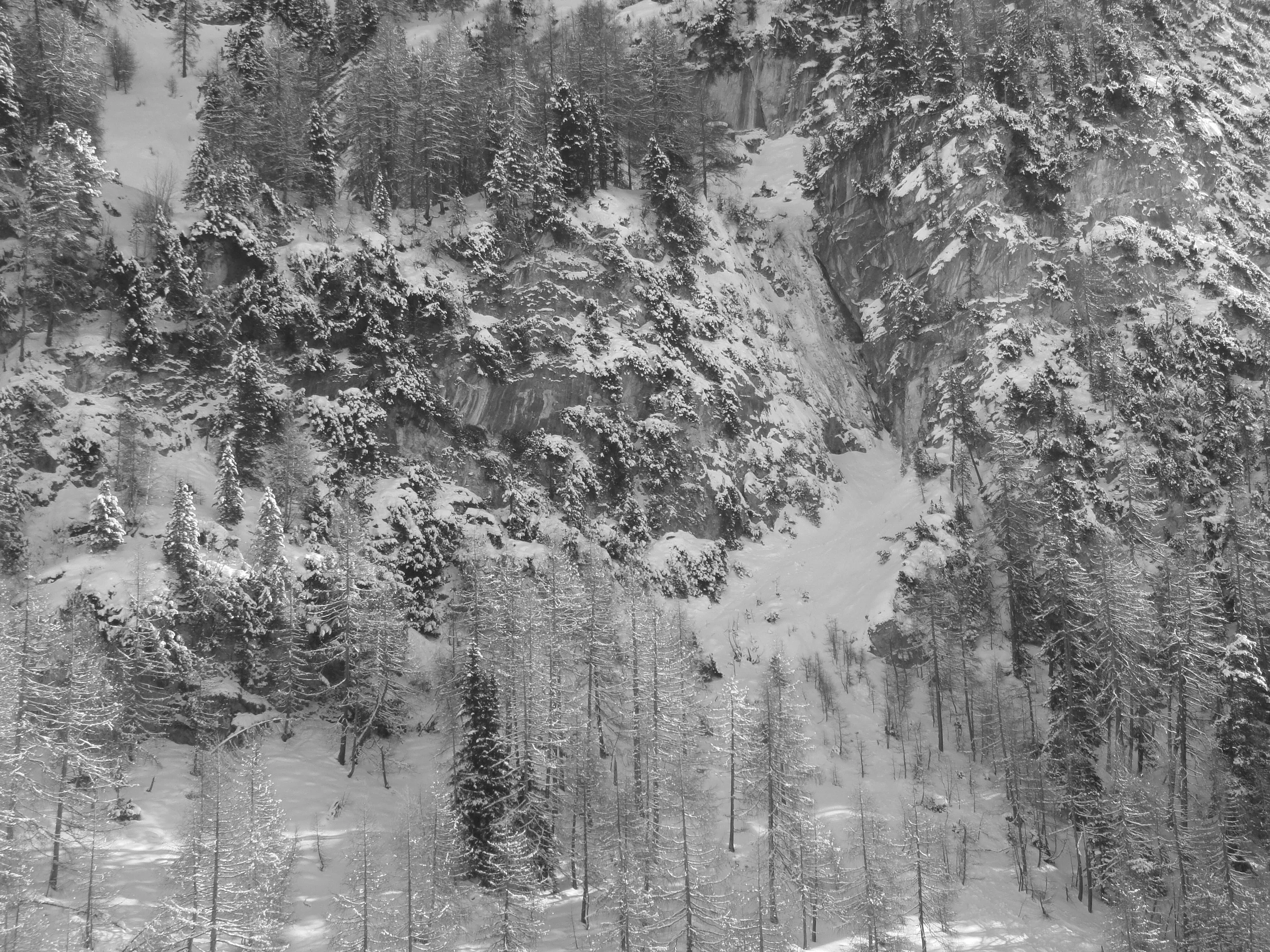 Höhepunkte dieses ebenso intellektuellen wie sinnlichen Gestaltens bietet die Serie «Berge». Der Blick trifft auf steile verschneite Hänge und schroffe Felspartien, er findet weder Übersicht noch Halt. Da ist nichts touristisch Schönes, keine erhabene Bergwelt. Der Schnee scheint nass und schwer, rutscht da und dort gefährlich in die Tiefe. Waldpartien zeichnen Ornamente von Stämmen und Geäst ins Weisse. Eine neblige Luft trübt da und dort die Sicht und lässt dann doch den nassen Fels im Bild so plastisch hervortreten, als könnte man seine Härte ertasten.