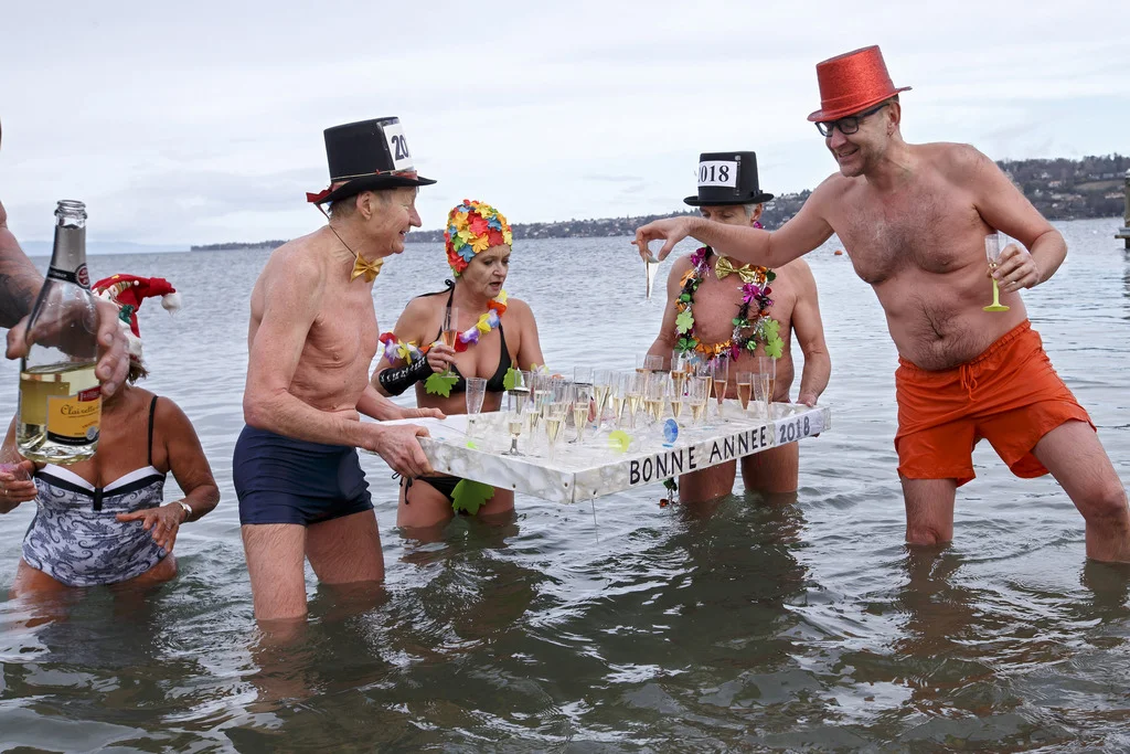 Etwa 60 Genferinnen und Genfer feiern im Bains des Paquis das neue Jahr auf ihre Art.