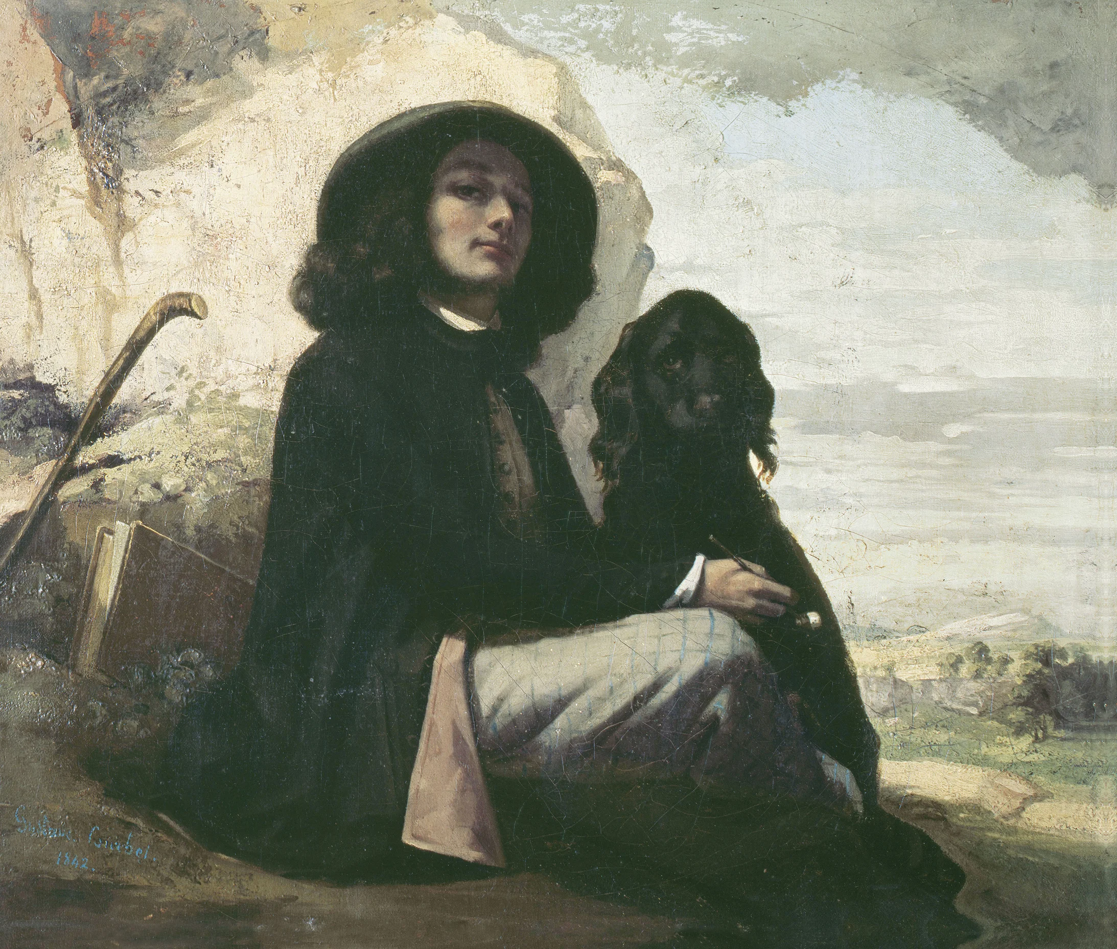 Der 1819 in Ornans in der Franche-Comté geborene und 1877 im Schweizer Exil gestorbene Gustave Courbet drängte als Zwanzigjähriger nach Paris zur Kunst, eignete sich zielstrebig Fertigkeiten und Kenntnisse an und debütierte nach fünf Jahren und mehreren gescheiterten Anläufen im Salon de Paris mit einem kühnen Selbstporträt: Courbet au chien noir (1842). Der Blick des jungen Mannes, der aus dem an romantische Vorbilder anknüpfenden kleinen Gemälde auf den Betrachter herunterschaut, ist ebenso fordernd wie selbstbewusst. Wer sich selbst so porträtiert, will an seiner künstlerischen Autorität und Souveränität keine Zweifel lassen, auch wenn er erst dreiundzwanzig ist.
