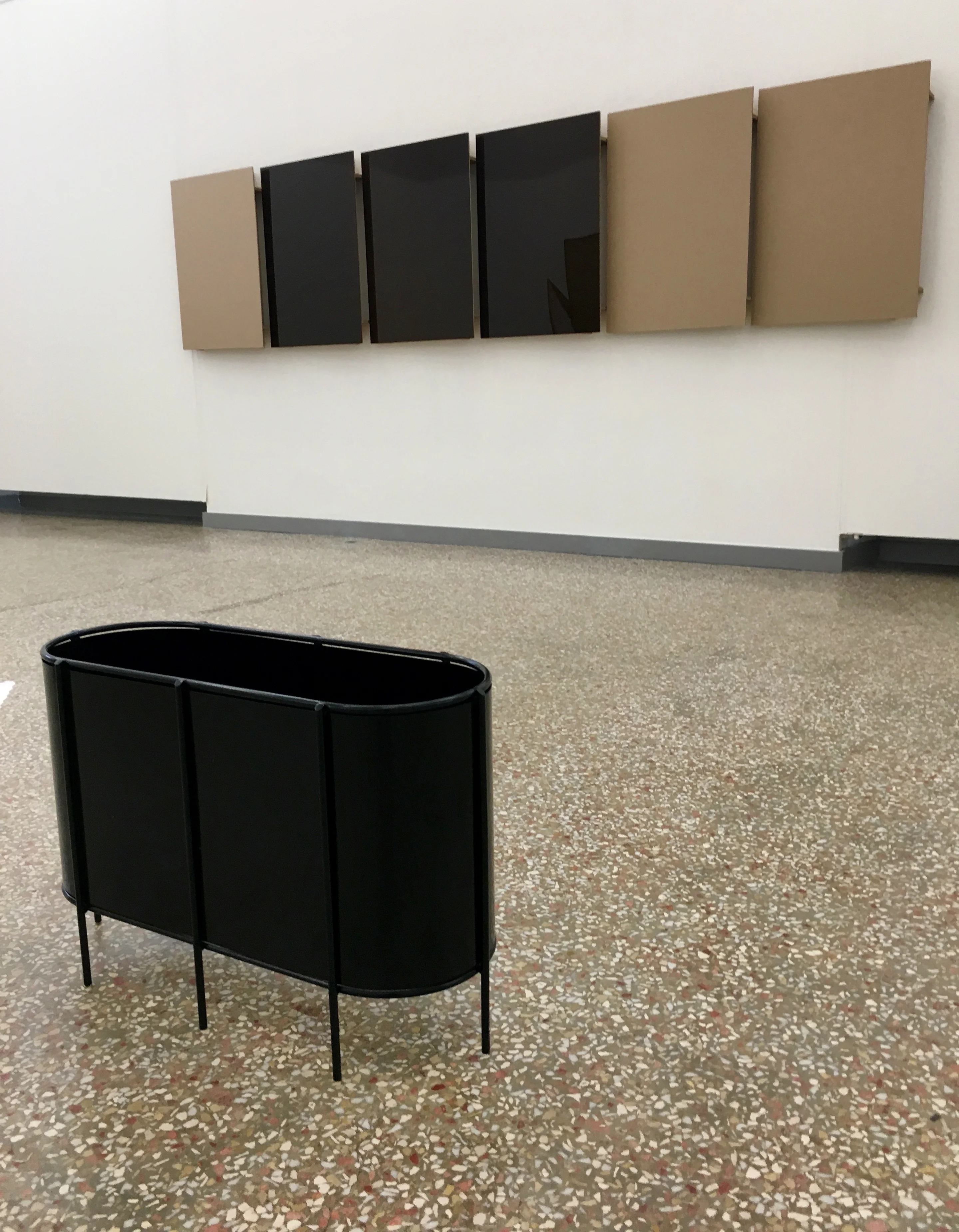 Das Objekt aus gebogenem dunklem Blech auf Stelzen, das eine Intim-Zone aus dem öffentlichen Bereich ausscheidet und schützt, zugleich aber ausstellt, wird einmal als „Balkon“ gewissermassen heroisiert, einmal wird es als Kleinformat auf dem Boden zum Spielzeug, einmal wird das Motiv zur langen Geraden gestreckt und so vor die Wand gestellt, dass wir uns auf die Frage, was sich denn hinter dem glänzenden Schwarz verberge, keine Antwort geben können. Immer aber geht es um Innen und Aussen, Verbergen und Entschleiern, Privates und Öffentliches.