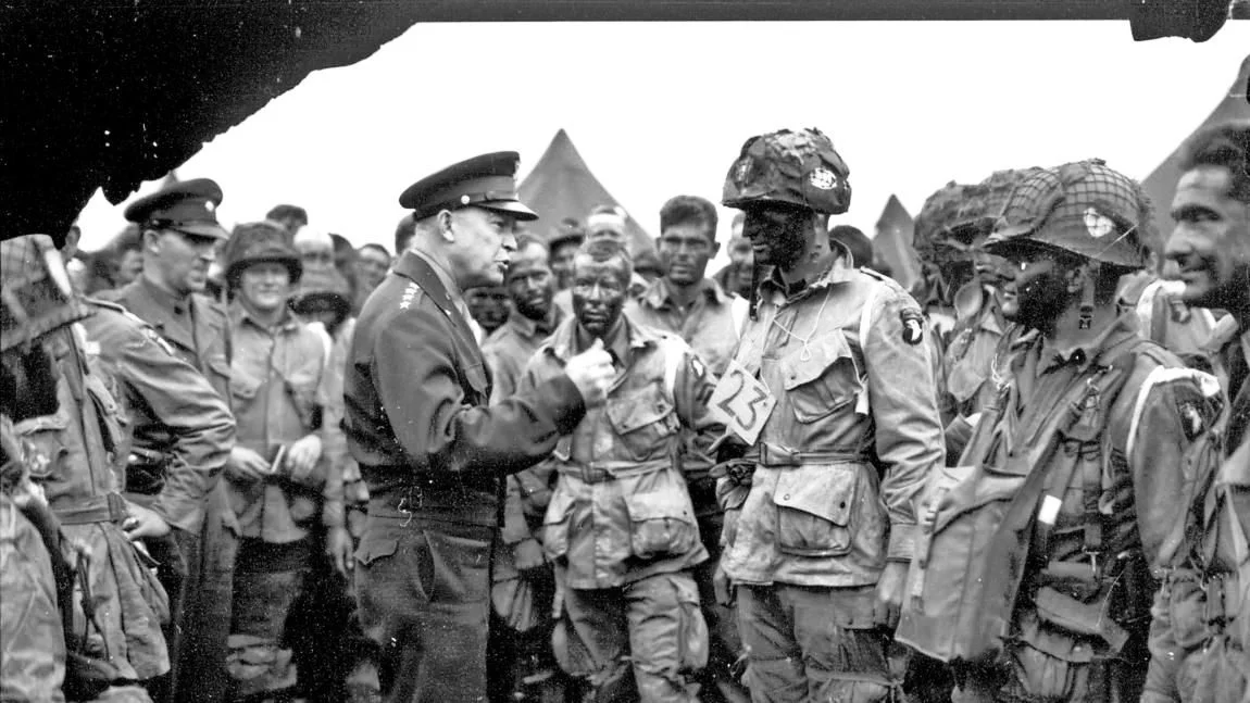 Kurz vor dem Beginn der Invasion gibt Eisenhower auf der Royal Air Force Base in Greenham Common, England, Soldaten der 101. Airborne Division letzte Anweisungen. (Foto: U.S. Army)