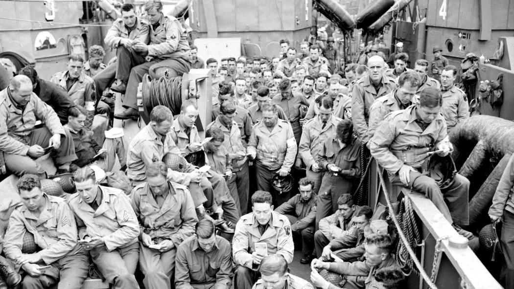 Vor der Überfahrt nehmen amerikanische Soldaten in ihren Landungsbooten an einem protestantischen Gottesdienst teil.