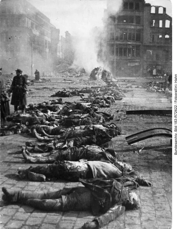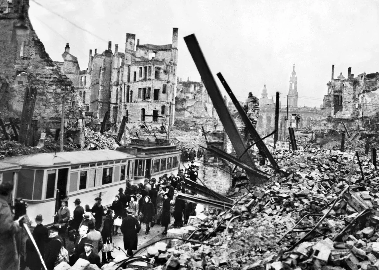 Die Royal Air Force und die United States Army Air Force bombardieren in mehreren Angriffswellen Dresden. Dabei sterben bis zu 25'000 Menschen. Weite Teile der Innenstadt sind zerstört. Historiker diskutieren heute, ob die Flächenbombardements als Kriegsverbrechen zu werten sind.